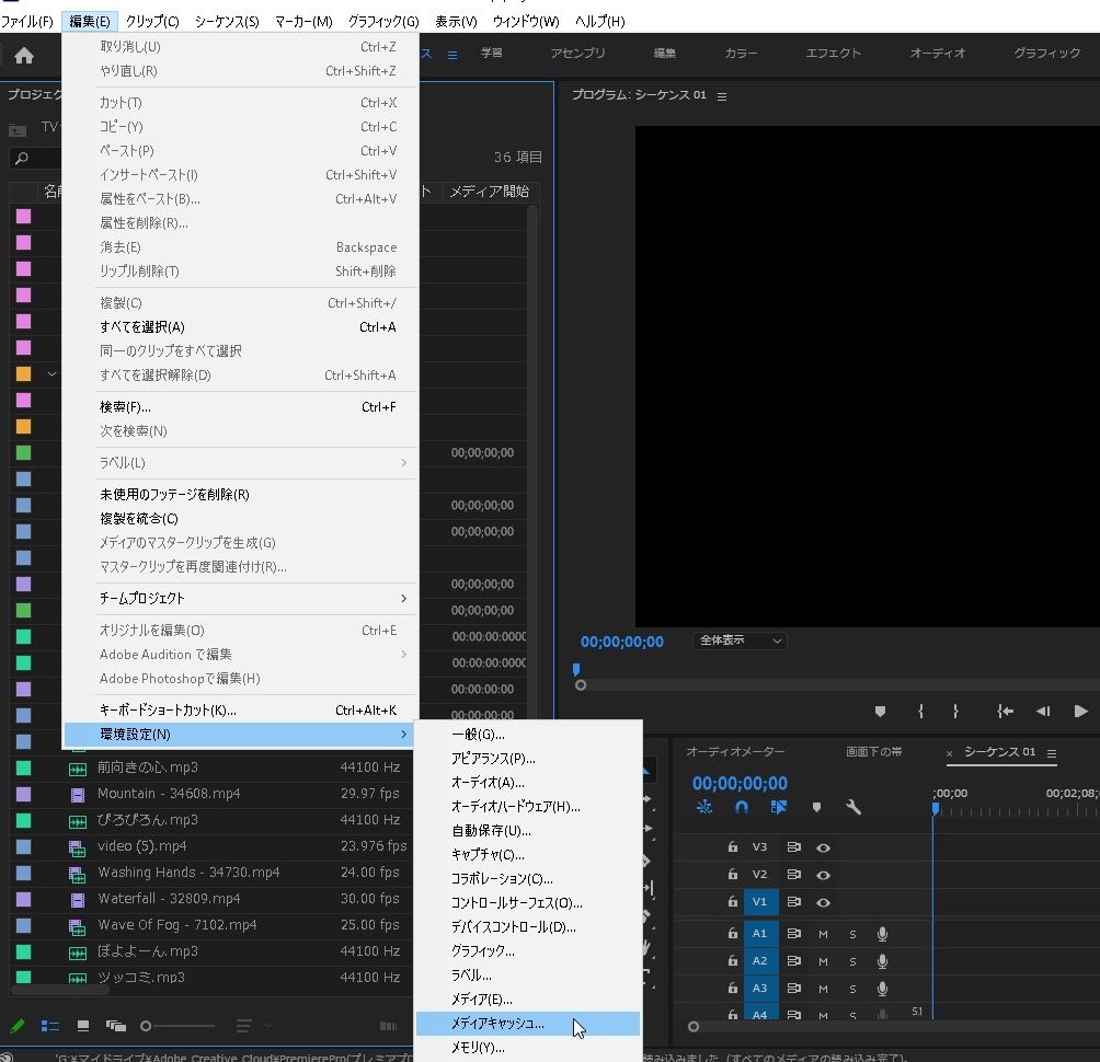 編集>環境設定>「メディアキャッシュ」から設定画面を開きます。