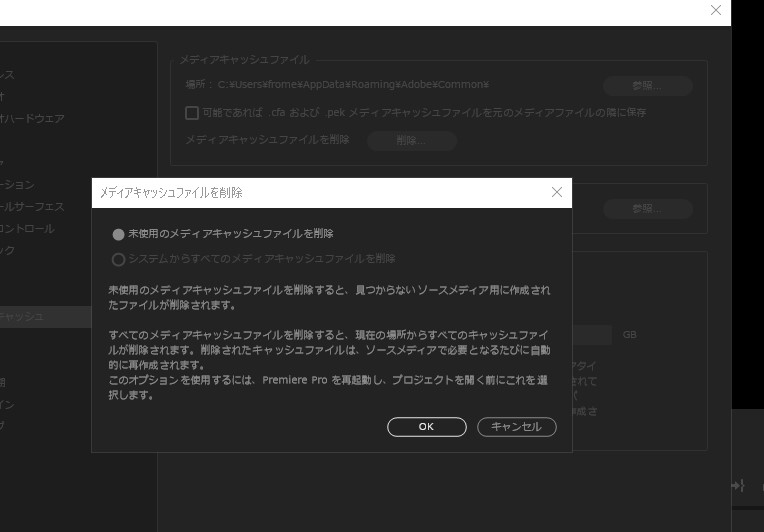 「未使用のメディアキャッシュファイルを削除」を選択してOKを押します。