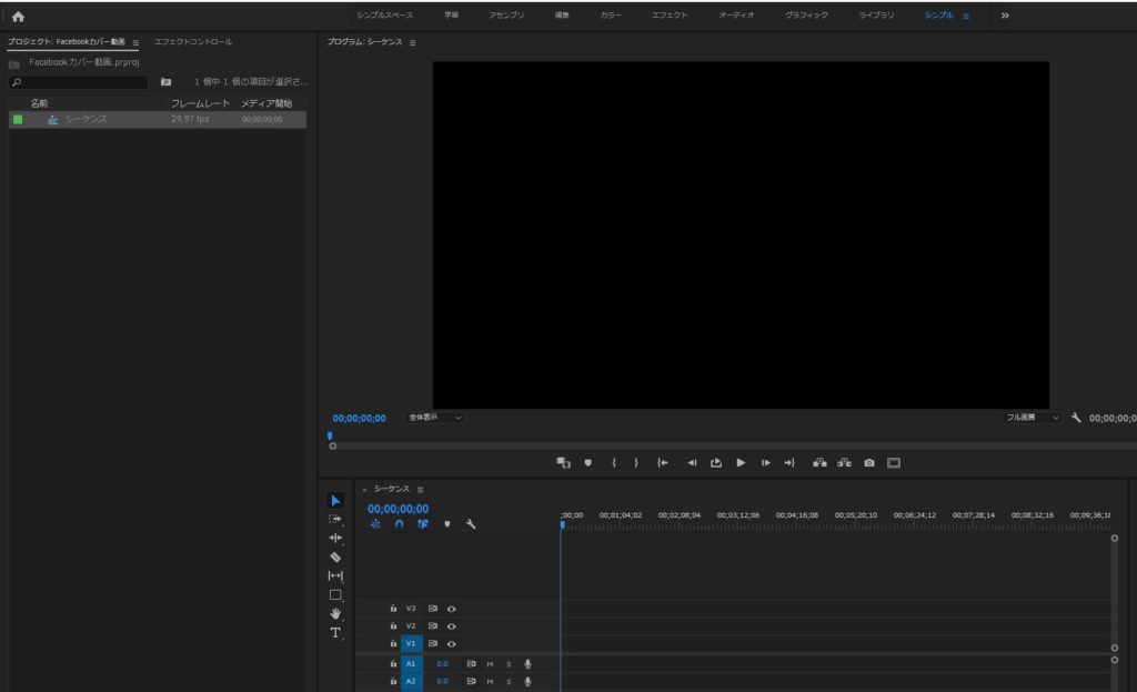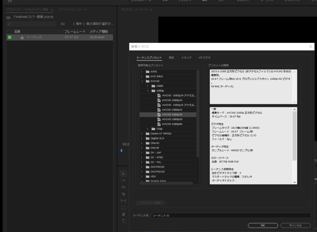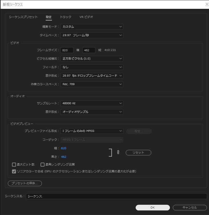 通常、シーケンスプリセットからシーケンスを選択することが多いかと思いますが、今回は「設定」に切り替えてみます。