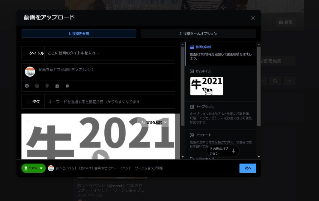 動画が「ライブラリ」に保存されていなかったので、先に「動画をアップロード」から、動画をアップロードします。
