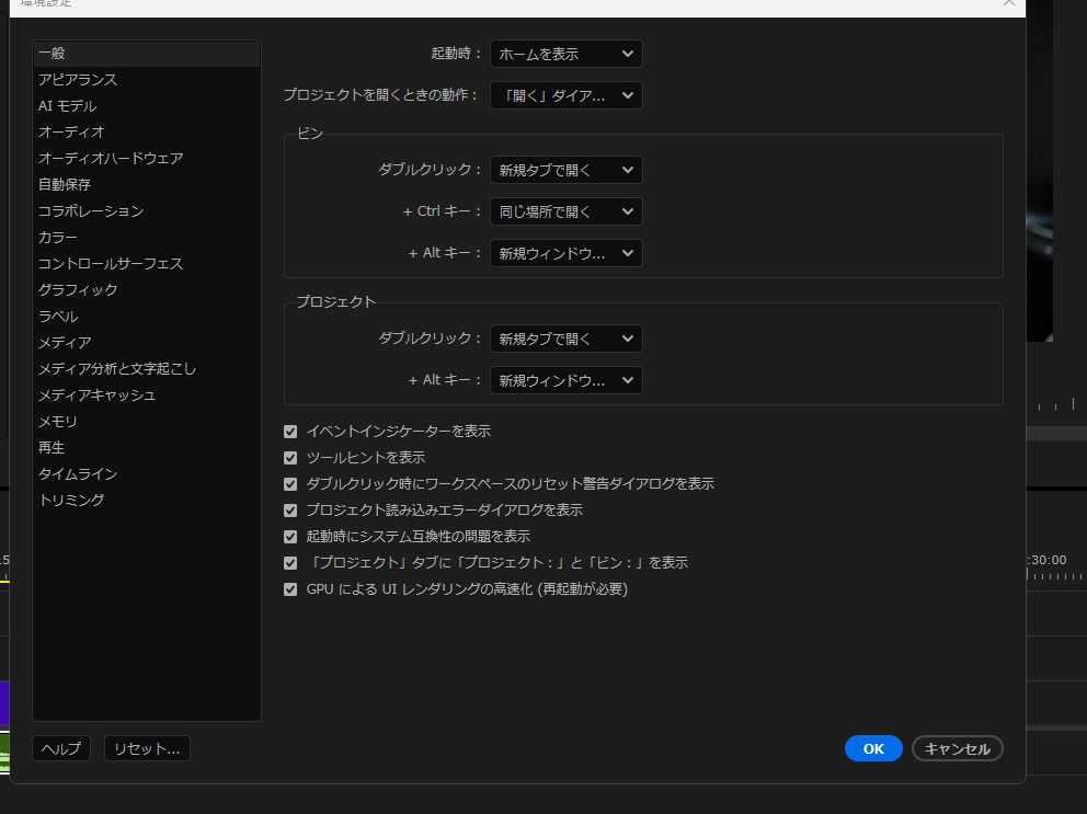 「Intel Arc グラフィックスがPremiere Proのサポート対象外」というものが起動時に毎回表示される場合があります。このような「システム互換性レポート」を毎回出さずに、無視して使いたい場合は、Premiere Proで次の設定をします。