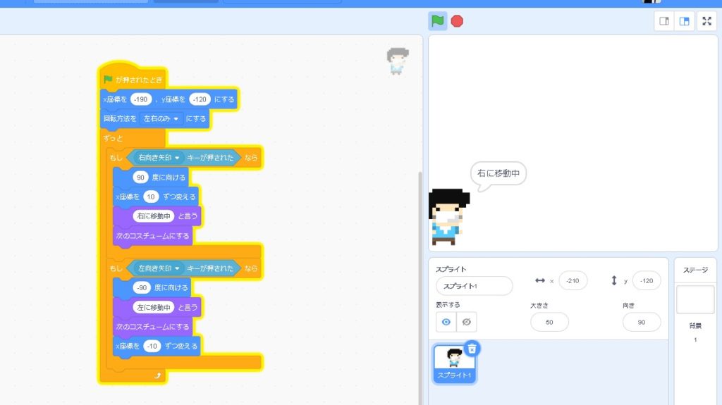 これで、コスチュームの向きが左右(反転)のみに固定されるので、角度がマイナスの時はコスチュームが左向き、プラスの時は右向きになります!