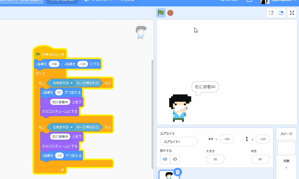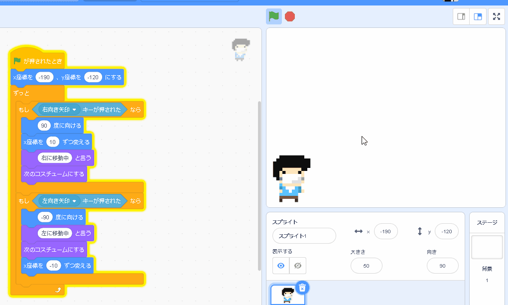 このままだと、左に移動した時にムーンウォーク状態になってしまうので、左矢印キーを押した時には「左向き」に切り替えるようにしたいと思います。