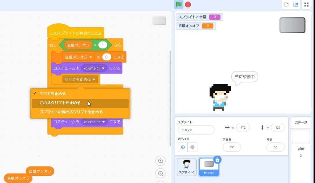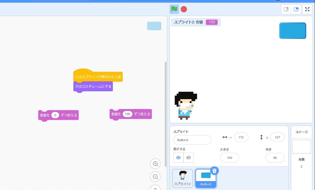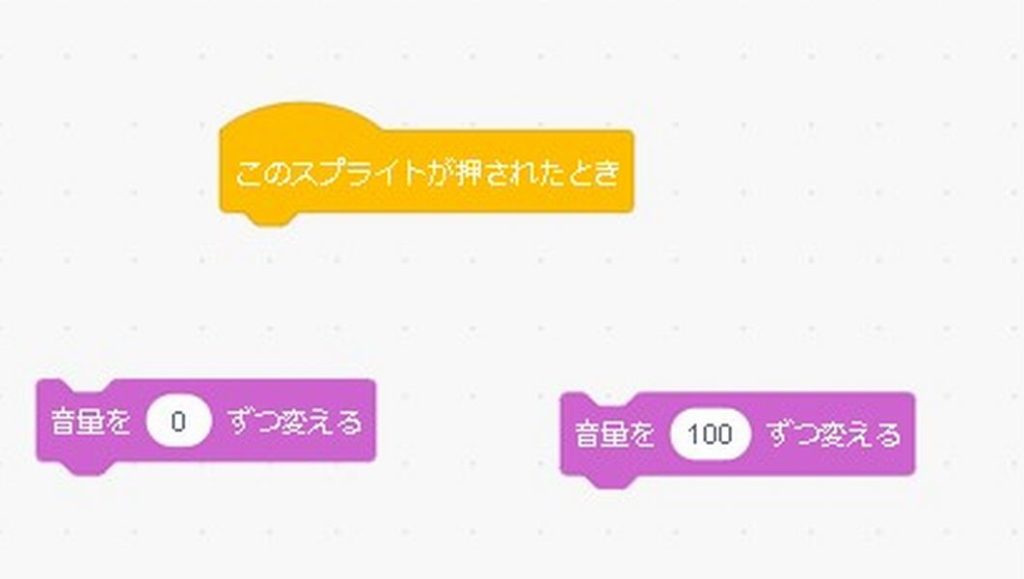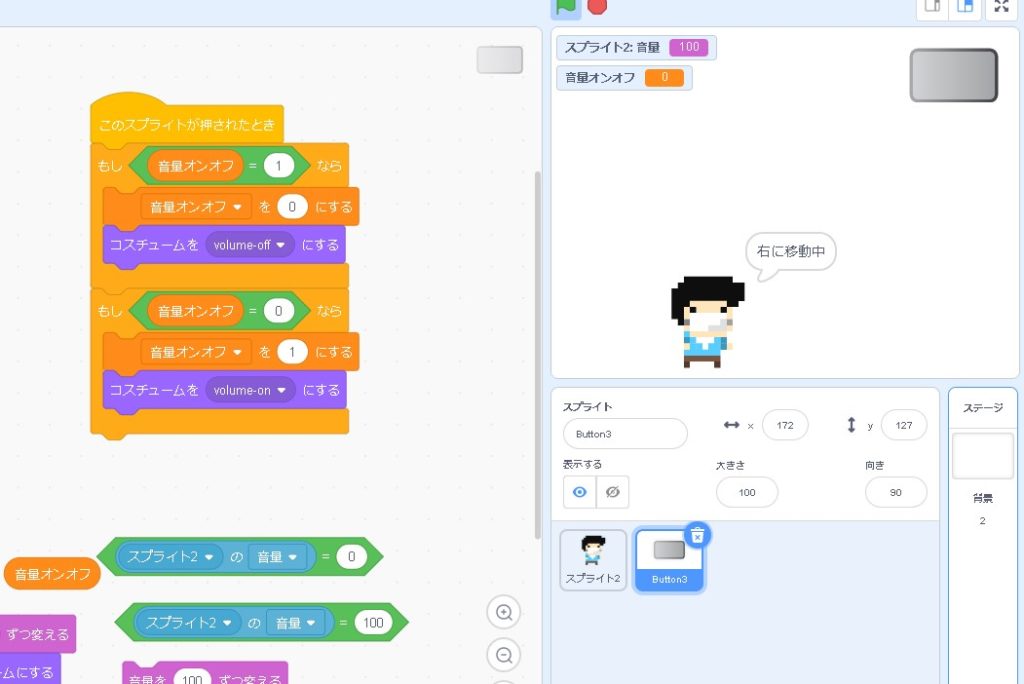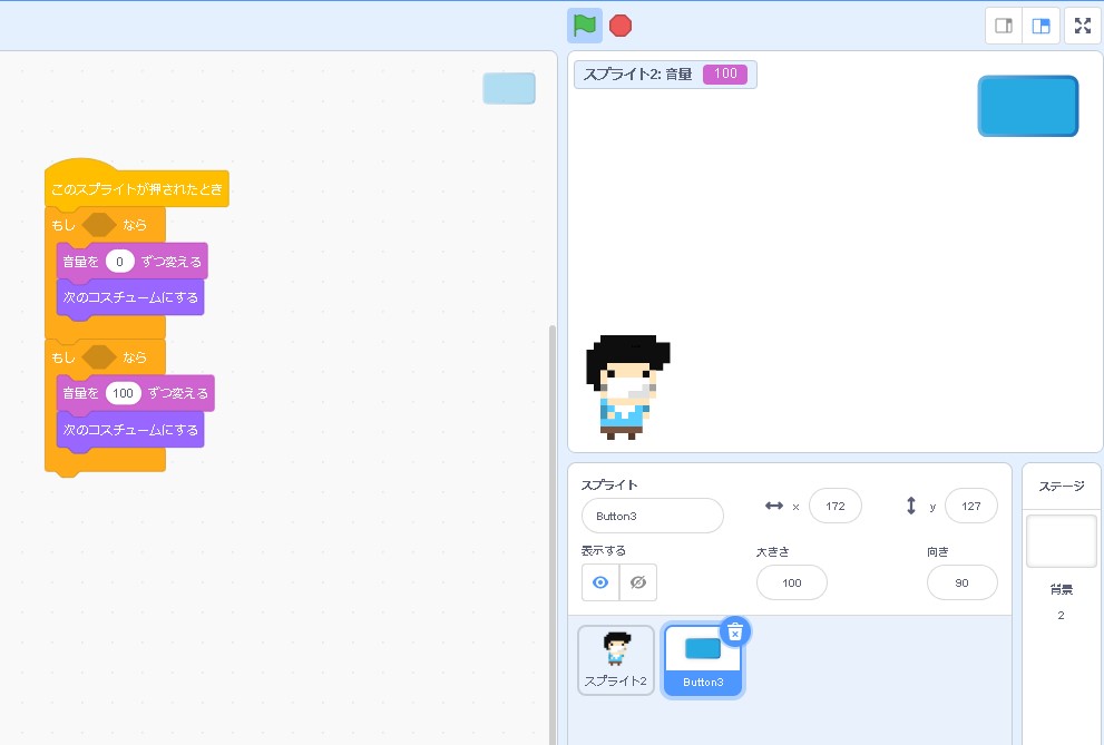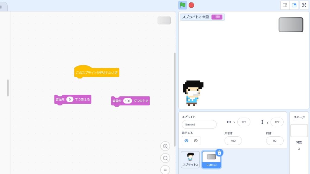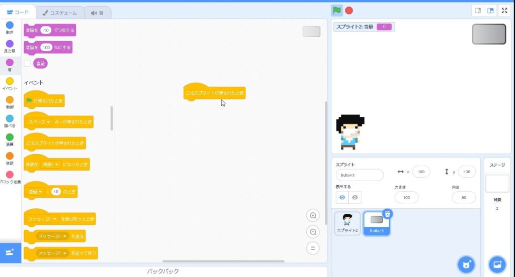 このままですと、スプライトを押した時に、コスチュームは変わりますが、音量が変わりません。音量が変わるのは、このスプライト(ボタン)だけです。
