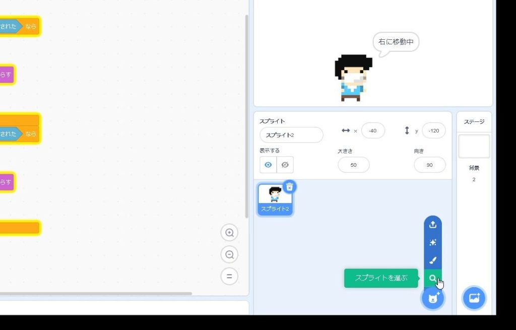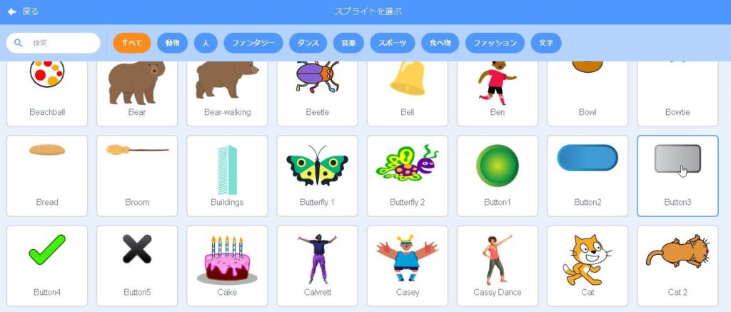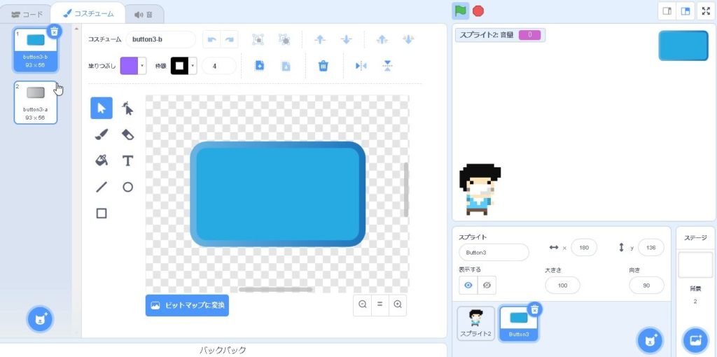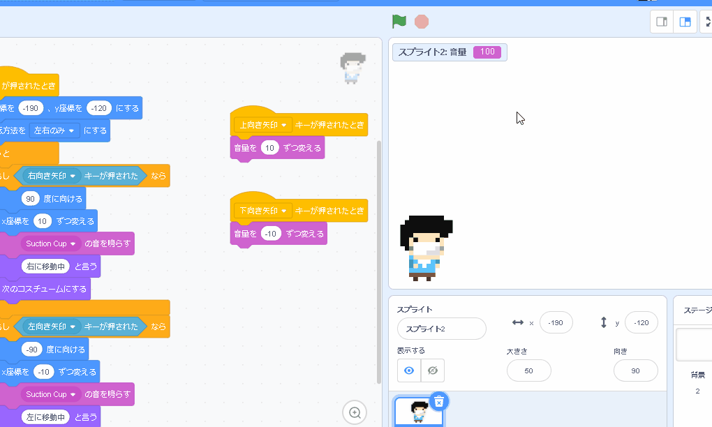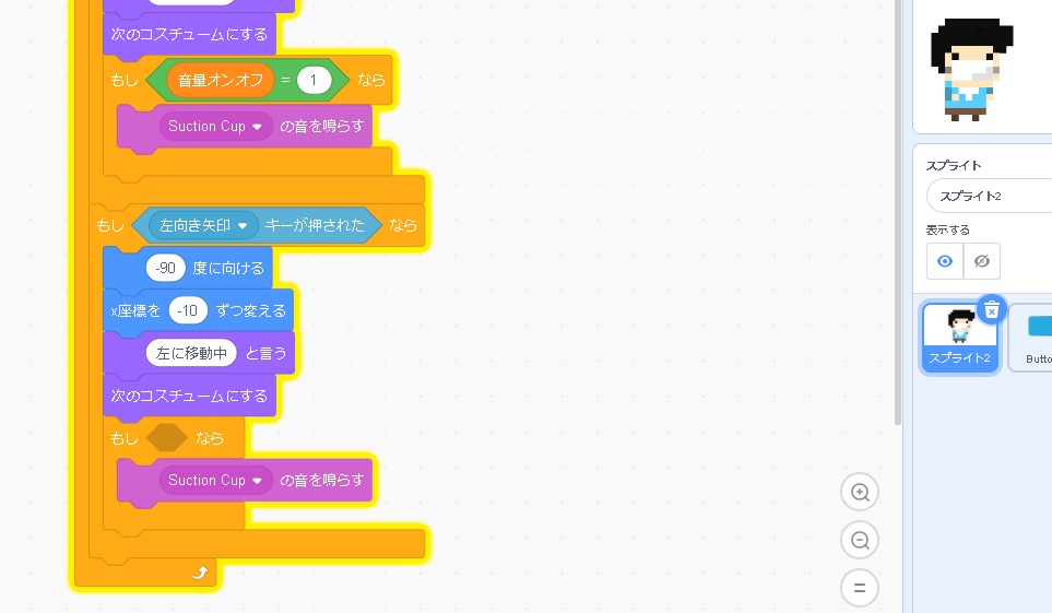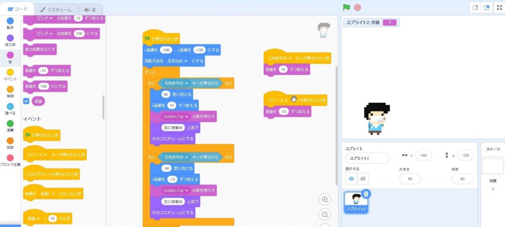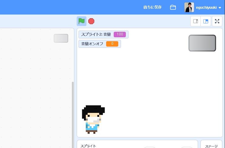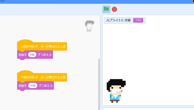 このままですと、スプライトを押した時に、コスチュームは変わりますが、音量が変わりません。音量が変わるのは、このスプライト(ボタン)だけです。