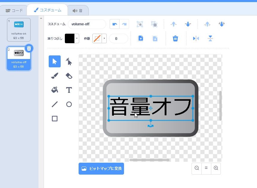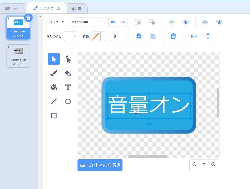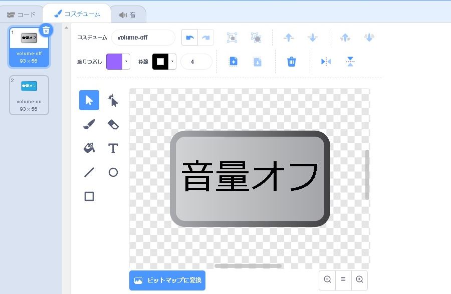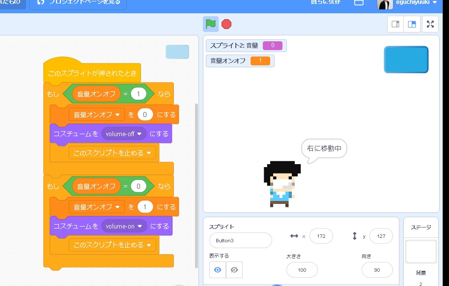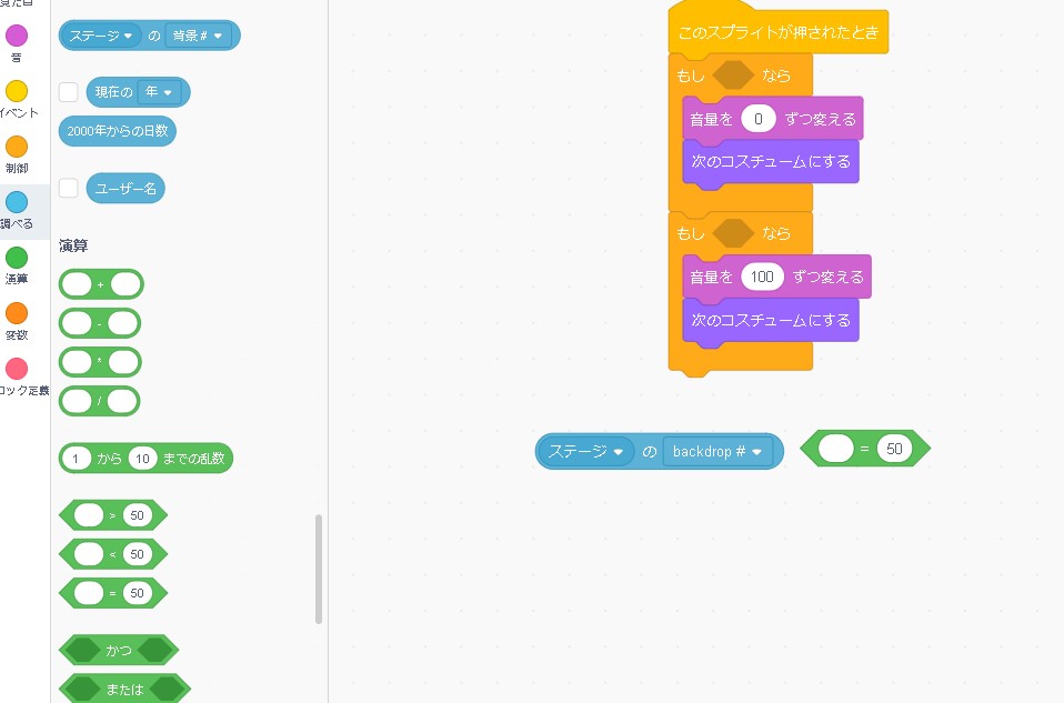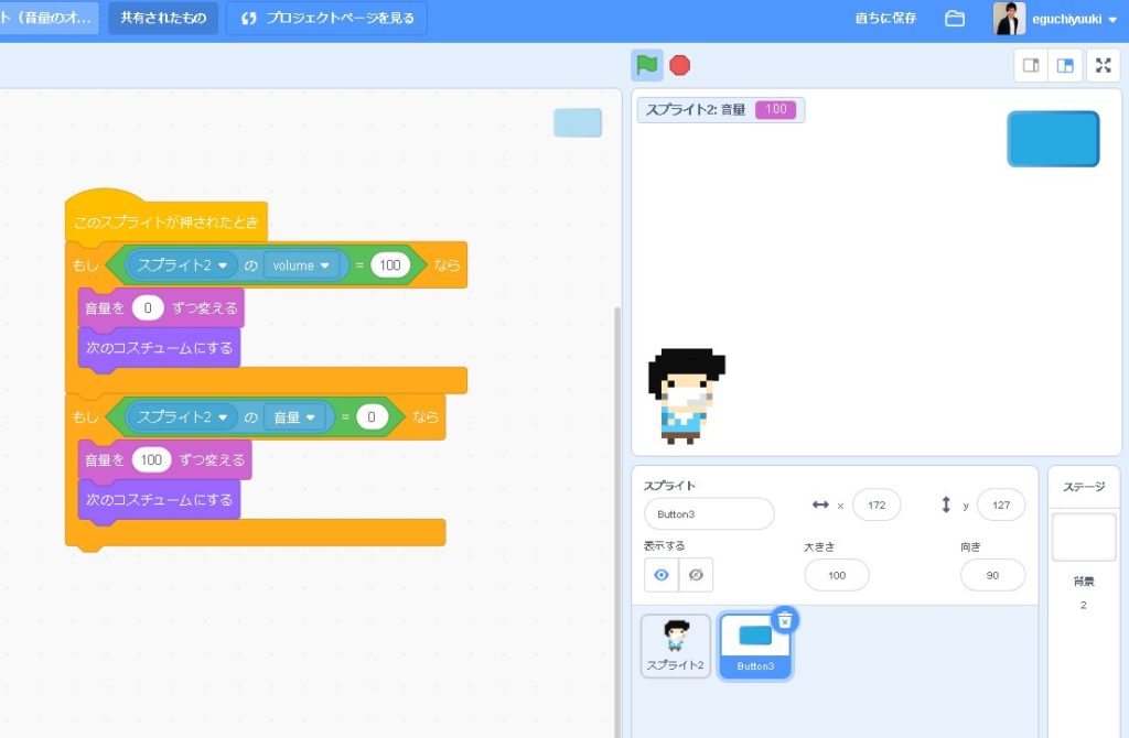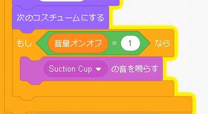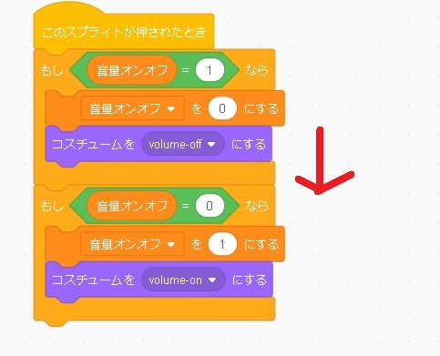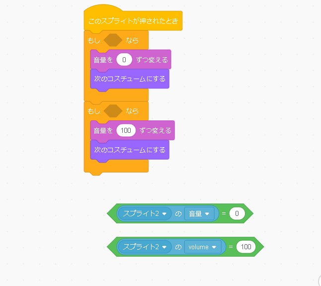 もし「音量コスチュームがON(青色)なら、音量コスチュームを次のコスチューム【OFF(灰色)】にして音量を0」にする。「音量コスチュームがOFF(灰色)なら、音量コスチュームを次のコスチューム【ON(青色)】にして音量を100」にする。