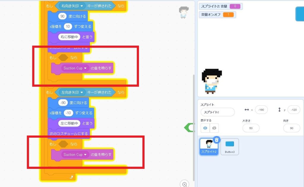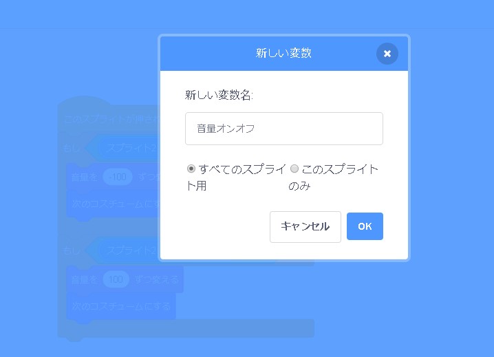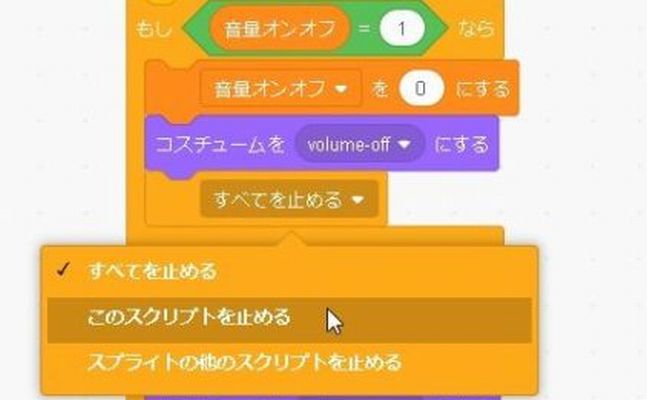 「もし音量オンオフ変数が1なら音を鳴らす」を追加してあげれば、1の時だけ音がなるということになります。