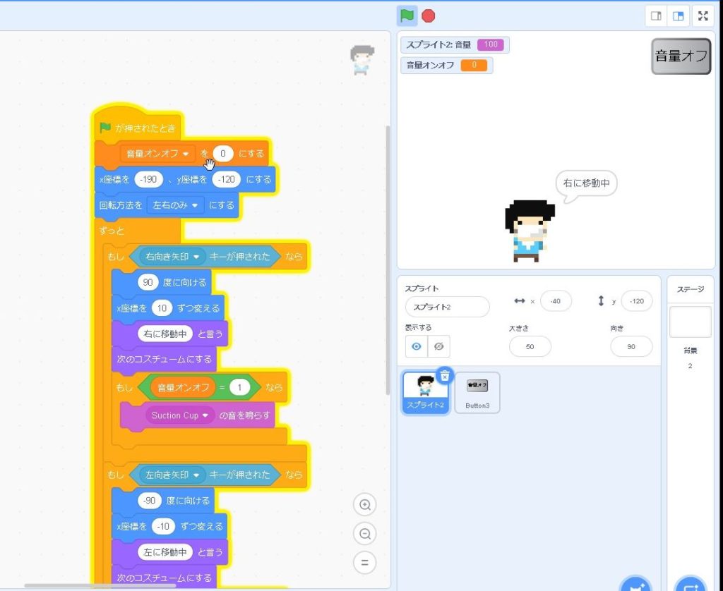 ただし、このままではキャラクターの「上矢印キーと下矢印キー」を使うことになってしまいますので、この先、例えば「上矢印キーでジャンプ」みたいな機能を追加させる時にまずい気がするのと、キーボードをそのまま音量調整に使うのは良くない気がしますので、「音量オンオフボタン」を追加してみます。