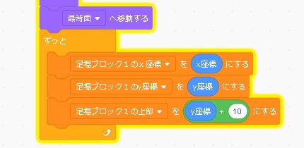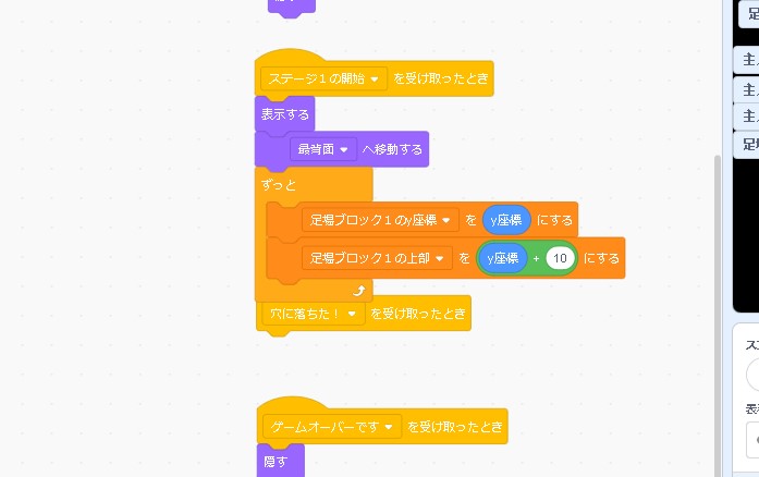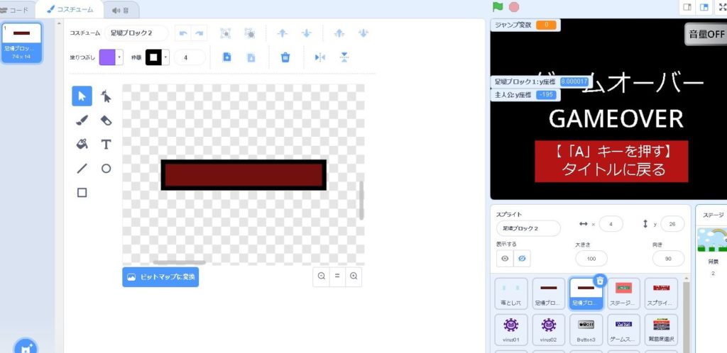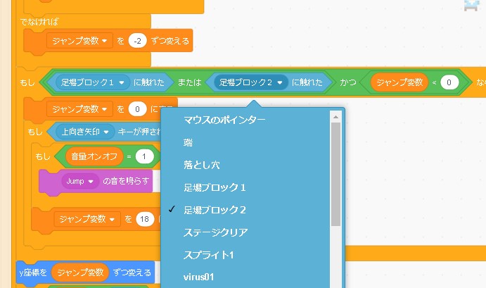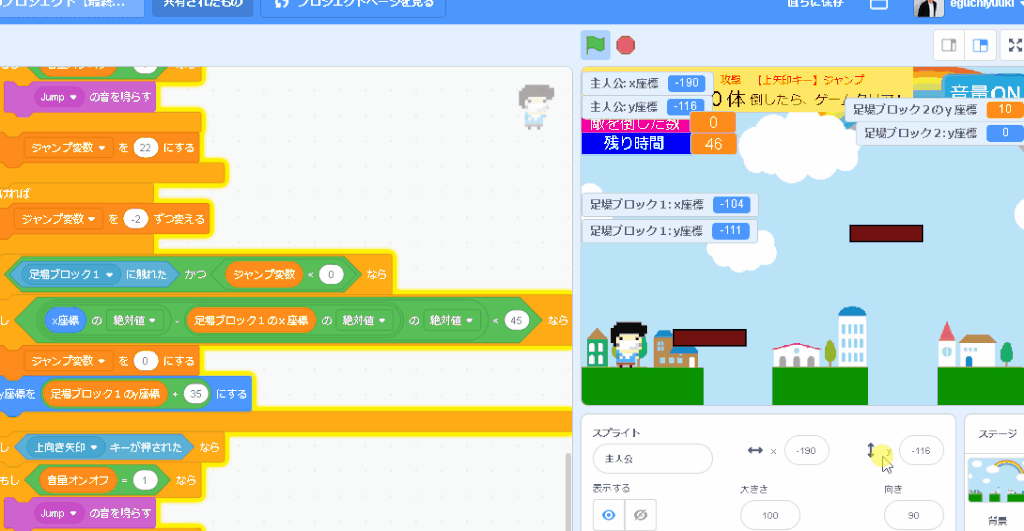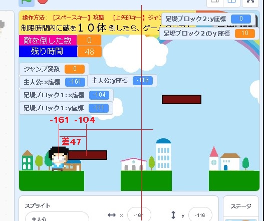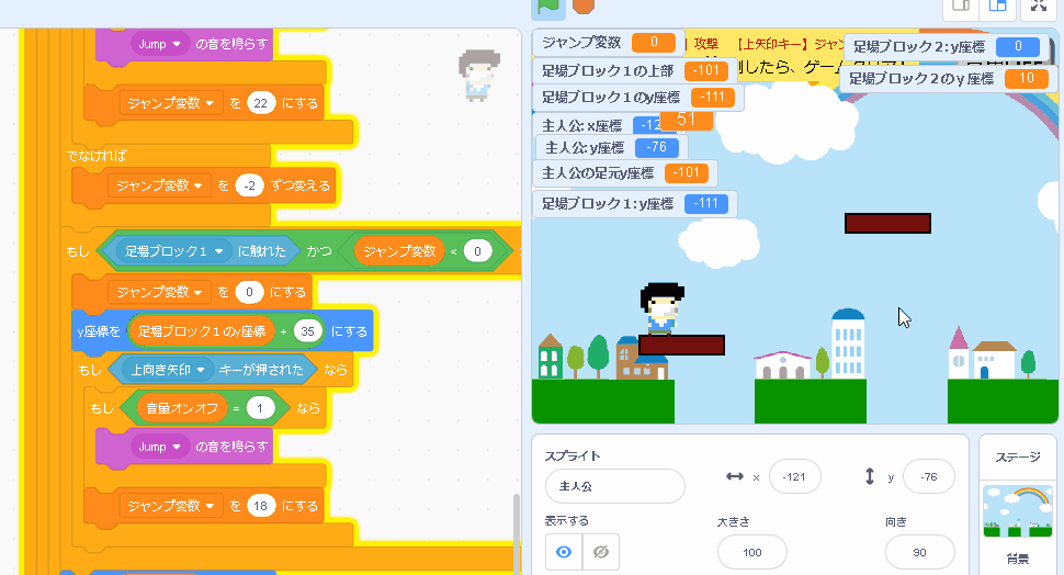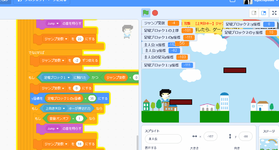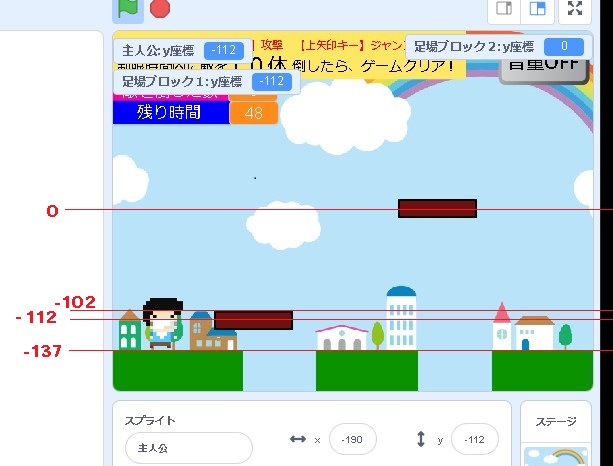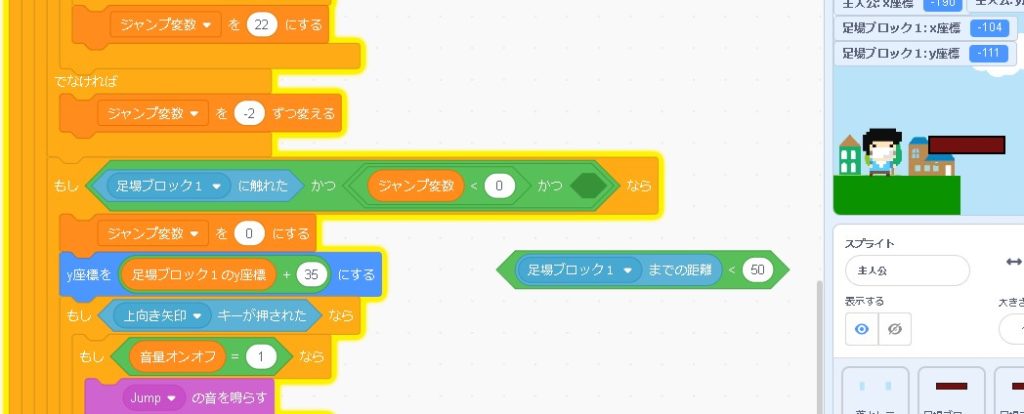 よさそうに見えましたが、これだとブロックの上でジャンプが出来なくなってしまいます・・・!「○○以上~」が無いのがスクラッチの辛いところです・・・!!