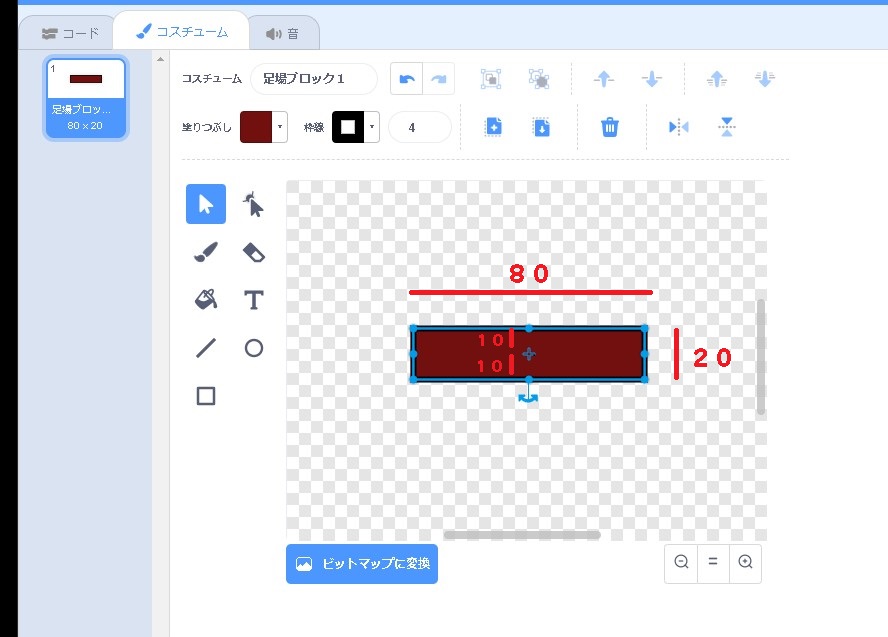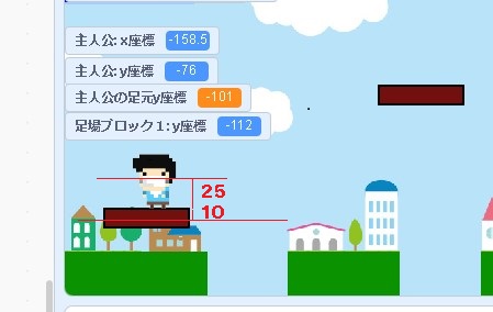 「主人公のy座標-25」と「ブロックのy座標+10」に合わせると、ちょうど主人公の足とブロックの上部が一致する。