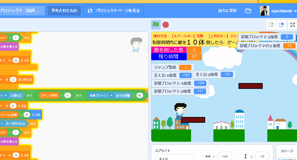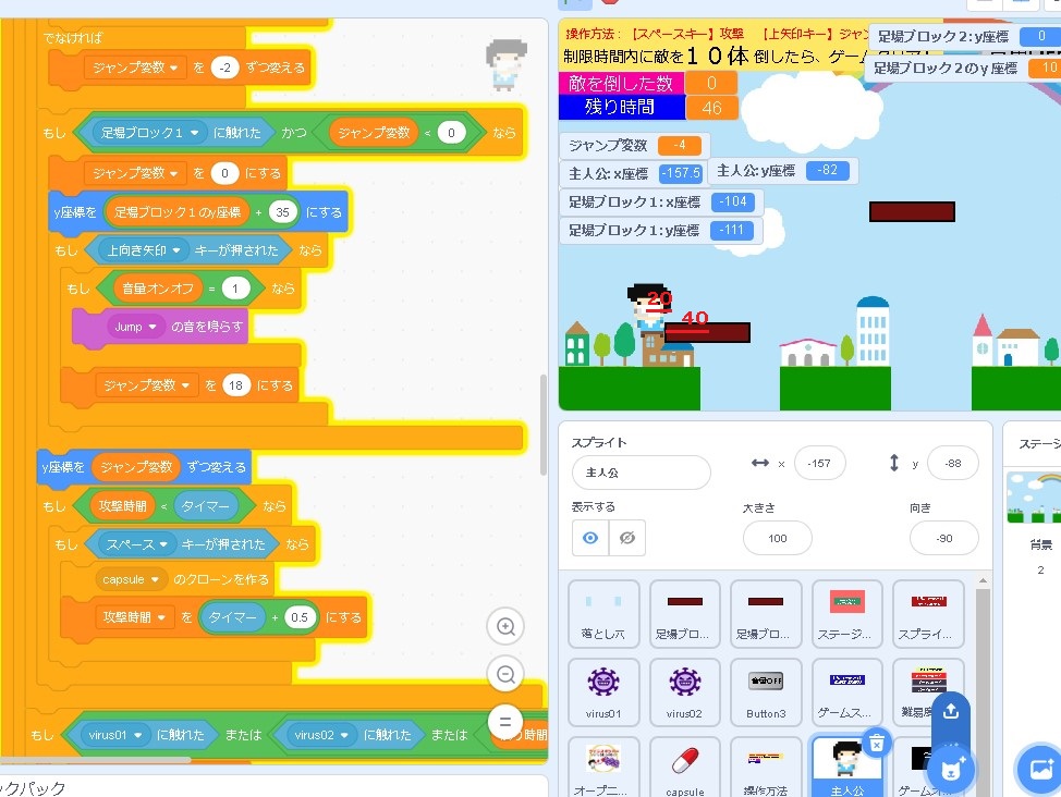 あとは、スペースキー押しっぱなしで、ブロックの下から2段ジャンプのような現象が起きないように、y座標の位置で調整をしてみます。