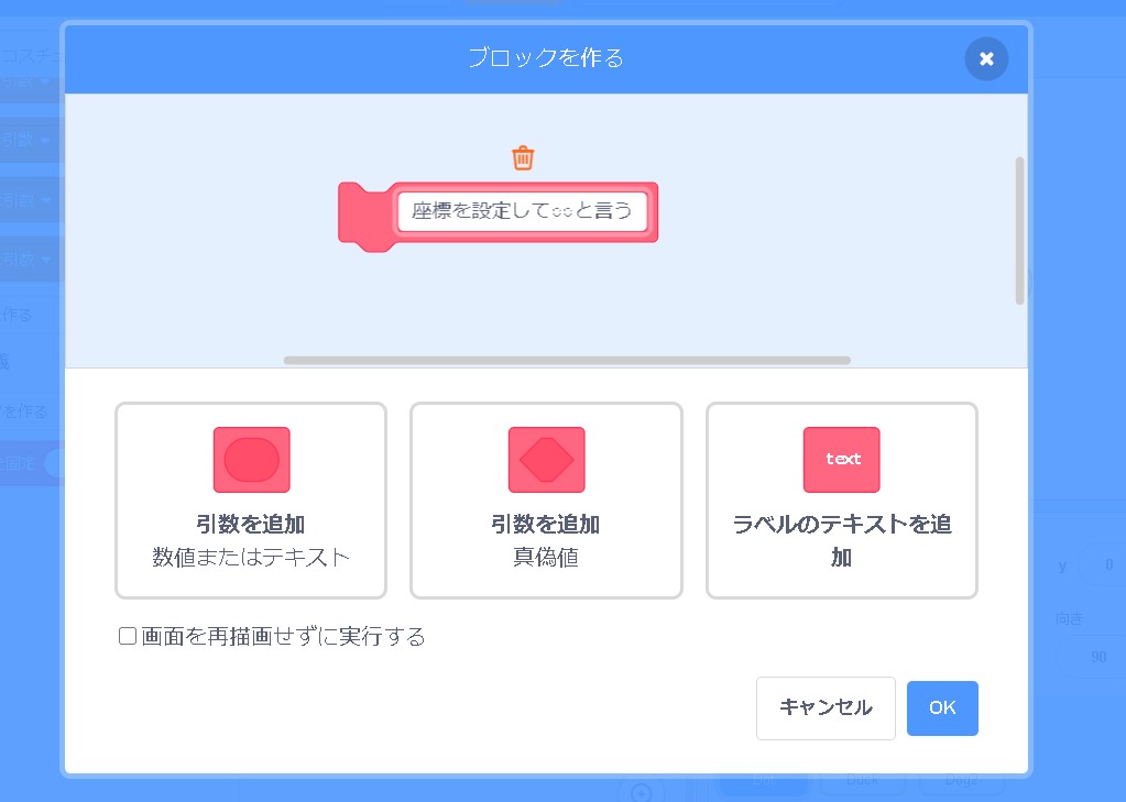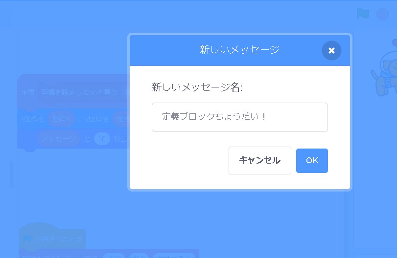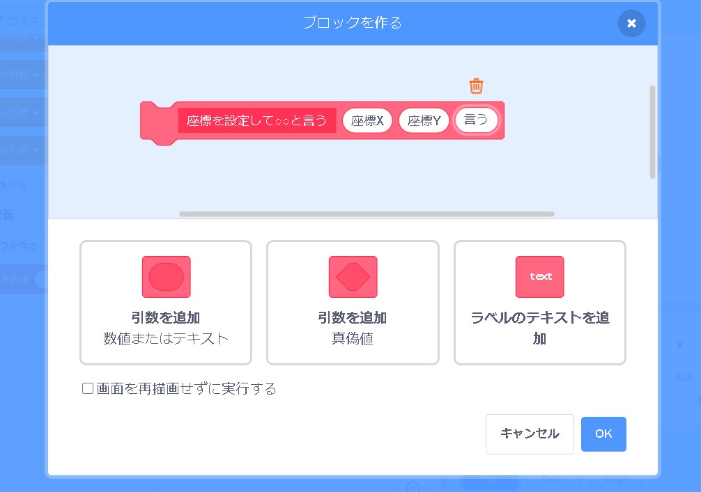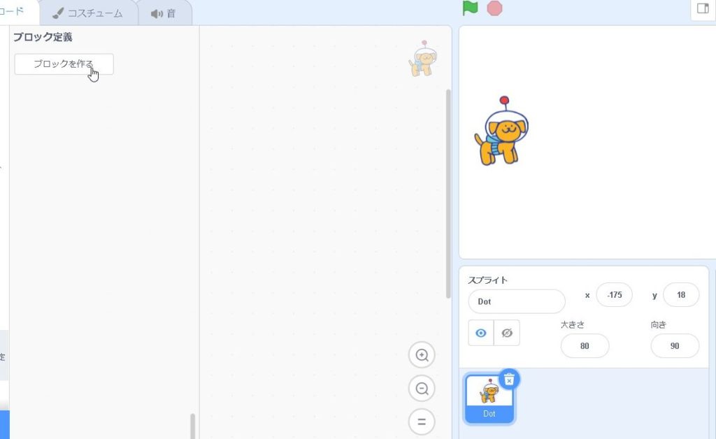 スクラッチの下の方にある「ブロック定義」というものを使ってみます。