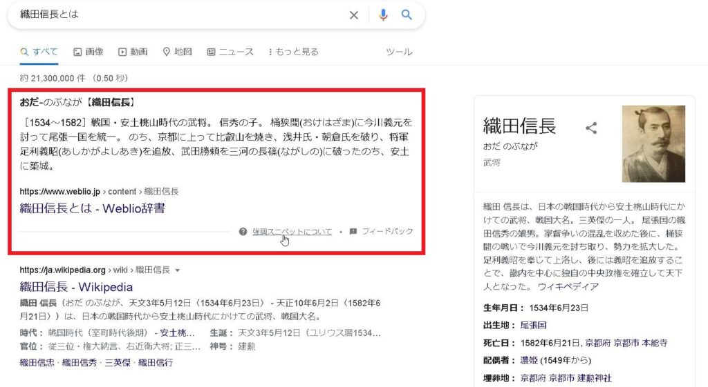 強調スニペットは、主に「~○○とは?」という検索をしたときに、その○○についての解説が先に表示されて、その結果がリンクとして表示されるという、通常の順番と逆転した状態になっています。