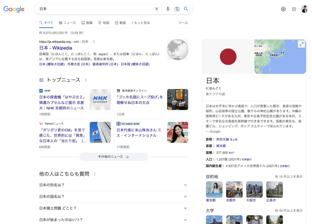例えば、Google検索で「日本」と検索すると「ニュース」「ナレッジグラフ」「他の人はこちらも質問」といった、様々なカテゴリが表示されます。