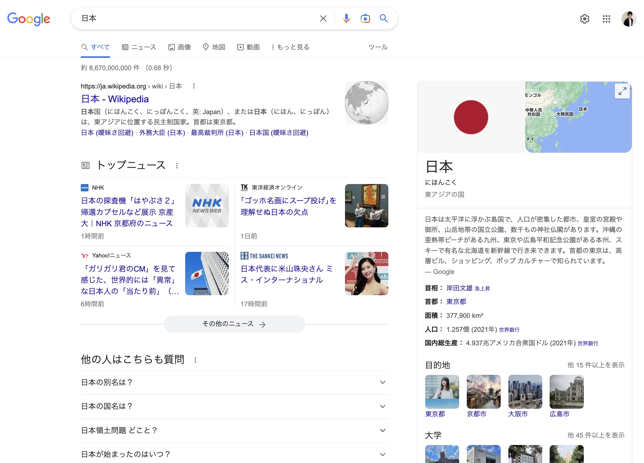 例えば、Google検索で「日本」と検索すると「ニュース」「ナレッジグラフ」「他の人はこちらも質問」といった、様々なカテゴリが表示されます。