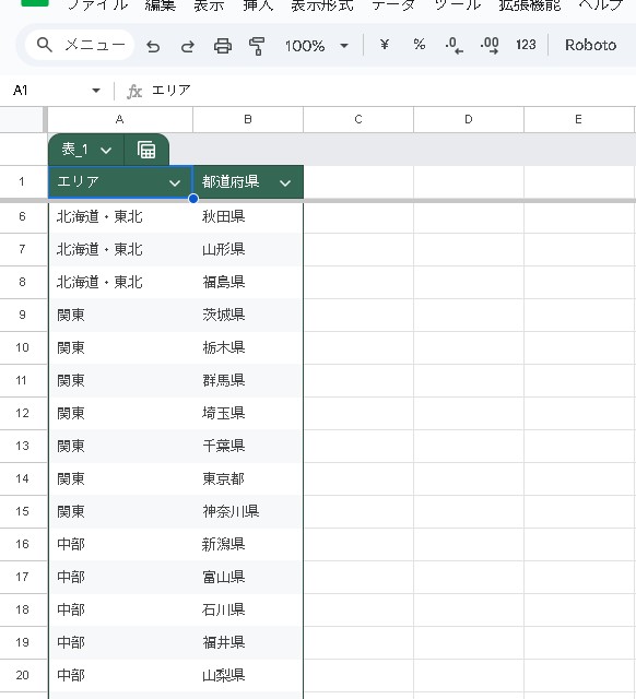 エリアと都道府県の関係をマスタシートに整理