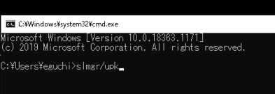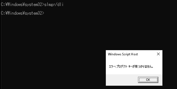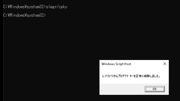 このコマンドでWindowsから現在のプロダクトキーが削除され、ライセンスされていない状態になります。