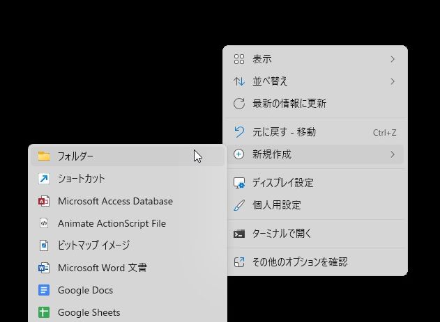 フォルダーを作成: 「新規作成」メニューから「フォルダー(F)」を選び、新しいフォルダーを作成します。