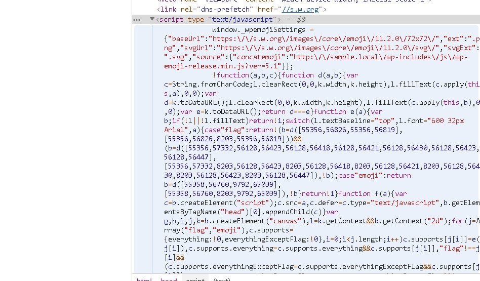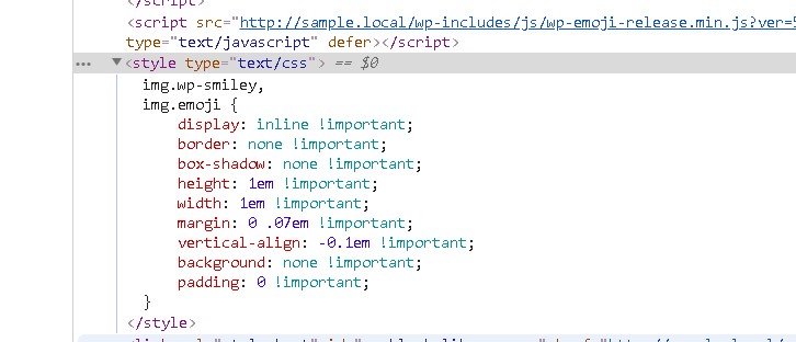 wp_head();で自動挿入されるhead部分の中に「window._wpemojiSettings」というscriptが入っています。