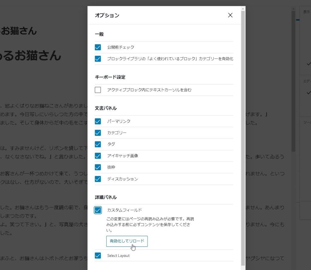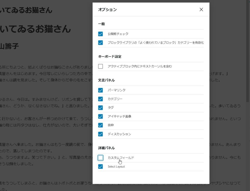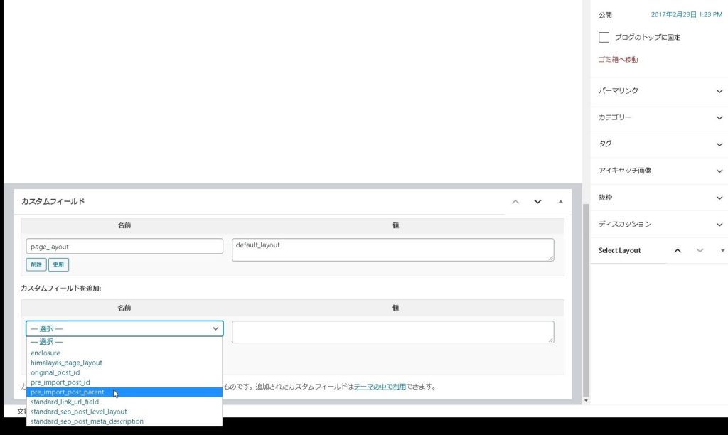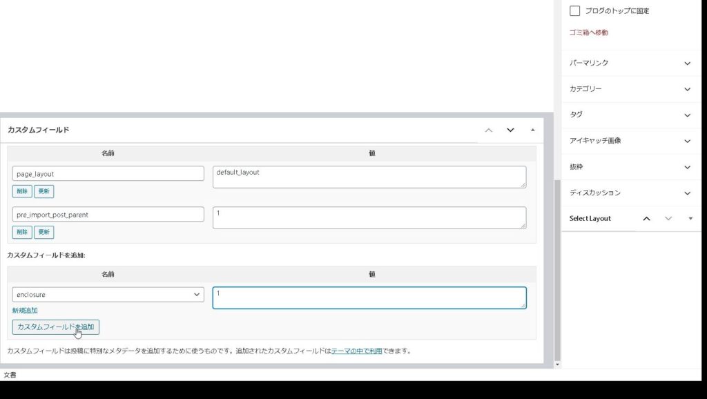 投稿ページの下部に「カスタムフィールドを追加」というメニューが表示されますので、カスタムフィールドに追加したい項目を選択します。