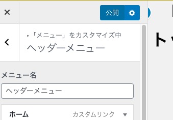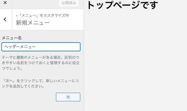 メニュー名を入力します。任意の名称なので何でもよいですが、分かりやすいように「ヘッダーメニュー」といった感じにしておくとよいかと思います。