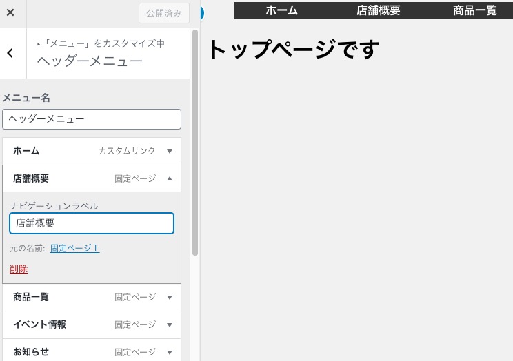 画面に表示させる文字部分(ナビゲーションラベル)を変更できます。固定ページのタイトルから変更したい時に使用します。
