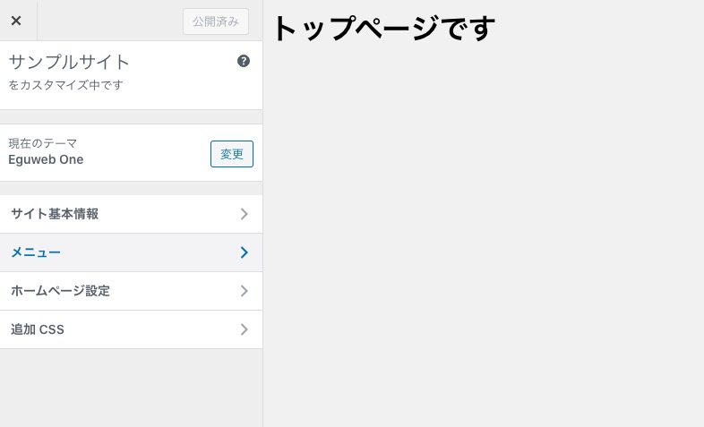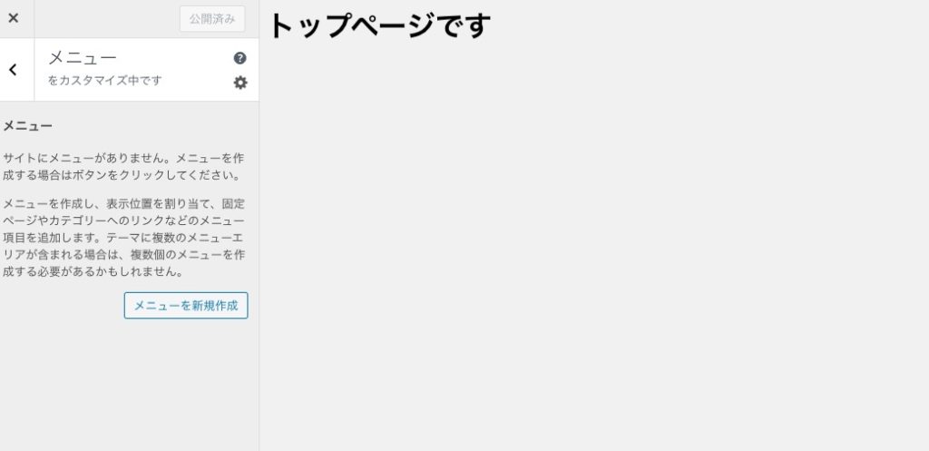 メニューの追加は「カスタマイズ」画面から行えます。ダッシュボードの「外観」>「メニュー」からも可能ですが、カスタマイズページの方が使い勝手が良いかと思います。