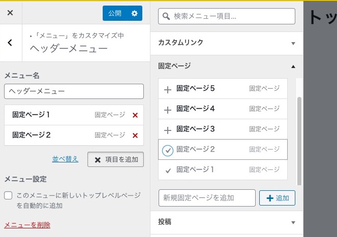 こちらにチェックを入れると、固定ページを公開したタイミングで自動的にその固定ページが追加されていきます。