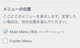 表示させたいメニューの位置を選択します。標準の場合は「Main Menu」と「Footer Menu」が表示されているかと思います。※この設定はテーマファイルに基づきます。