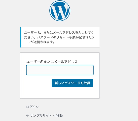 ただこのままだとワードプレスの「ユーザー名、またはメールアドレスを入力してください。パスワードのリセット手順が記されたメールが送信されます。」のページに移動するので、このあたりの処理も、おいおい追加してみたいと思います。