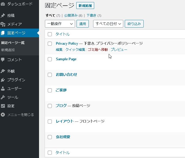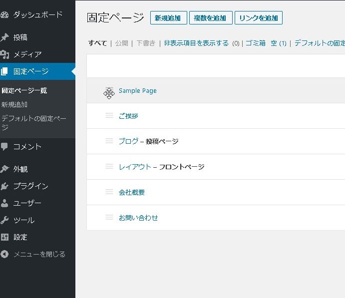 プラグインを有効化すると固定ページがドラッグアンドドロップで動かせるようになるので、あとはマウスを合わせてドラッグアンドドロップで並び替えをすることができるようになっています。