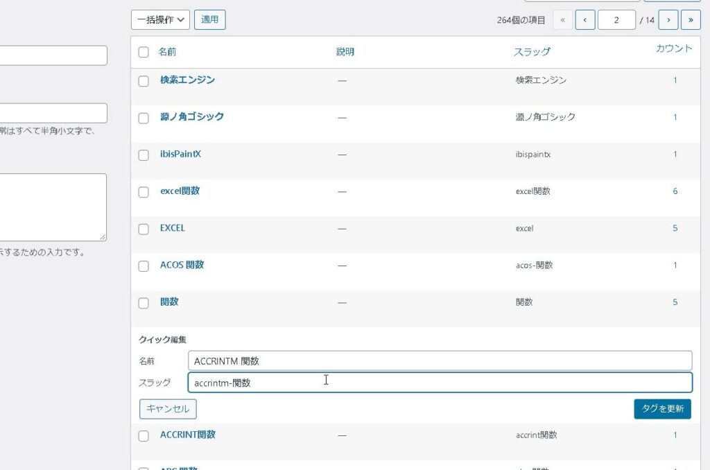 各タグの「クイック編集」を行うことで、スラッグを書き換えることができます。