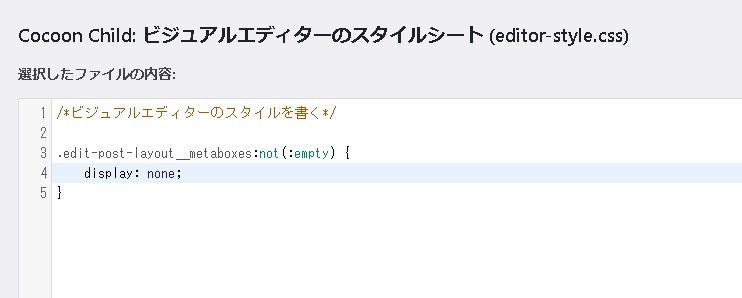 ・・・が、うんともすんとも消えませんでした。もしかすると、この「SEO、カスタムCSS、カスタムJavascript欄」は、このeditor-style.cssよりも後に読み込まれている?可能性がありそうです。