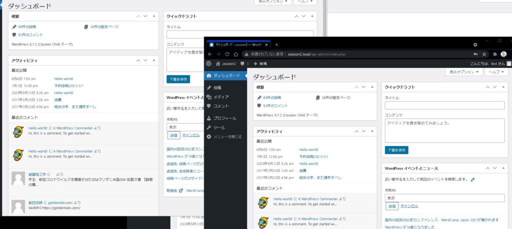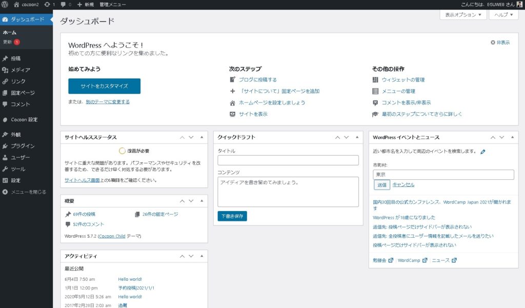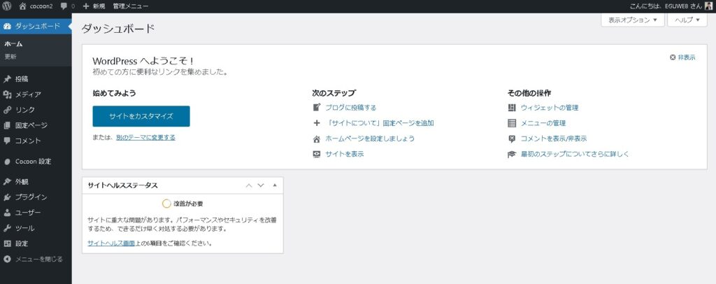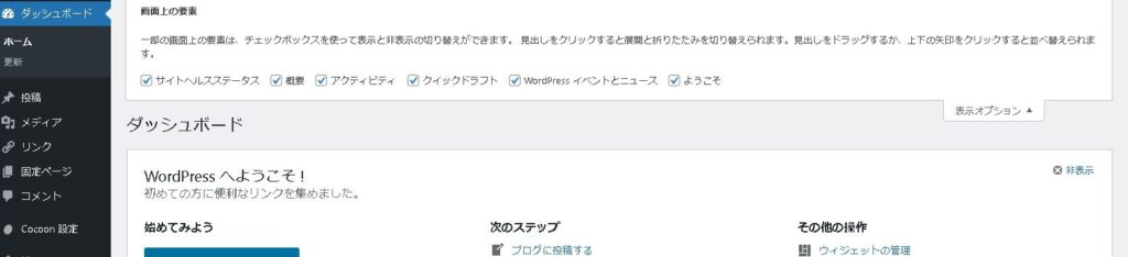 ワードプレスにログインした時に最初に表示される画面(/wp-admin/index.php)が「ウェルカムパネル」と呼ばれる場所です。