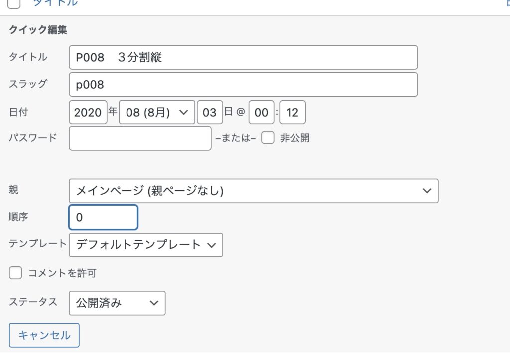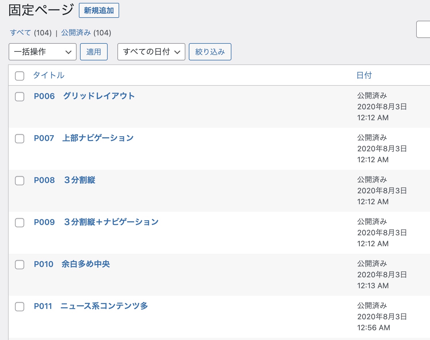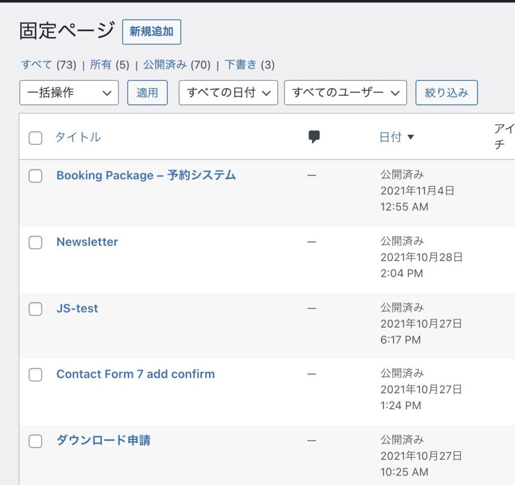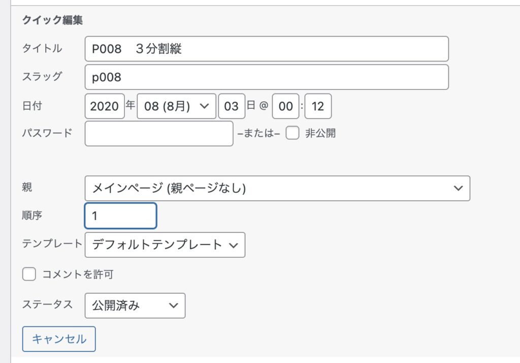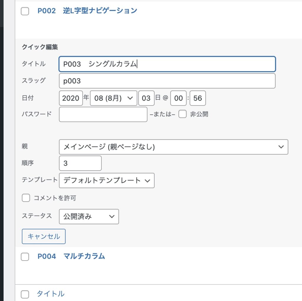 この方法の場合は公開日が変わってしまうことと、管理画面の「固定ページ」の一覧からでは直接この並び順にならないので、表示までにひと手間かかります。
