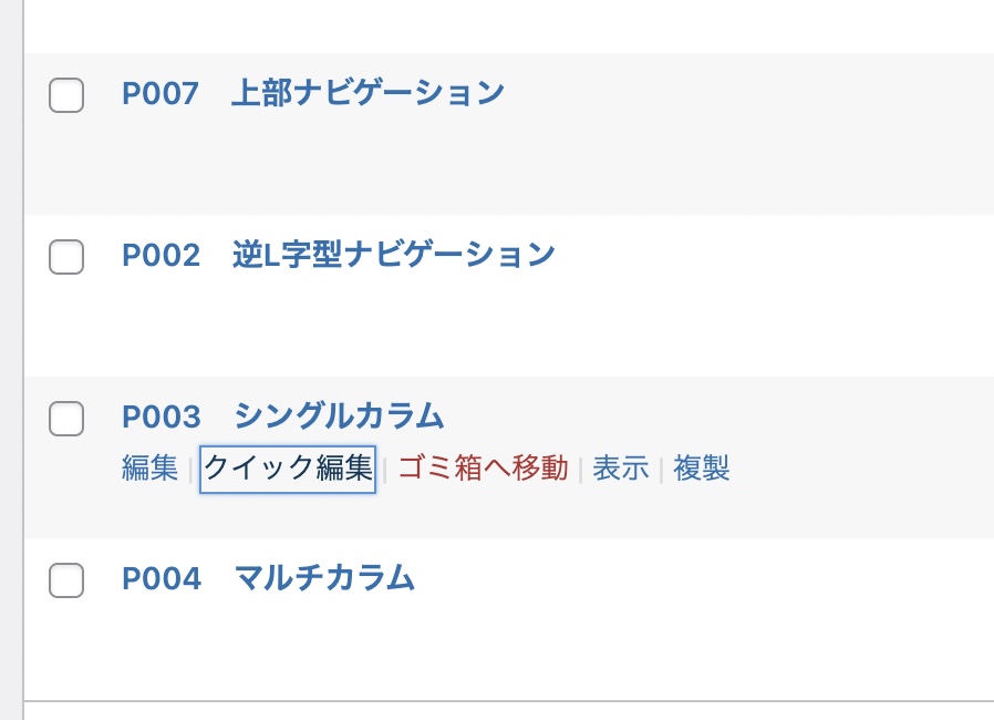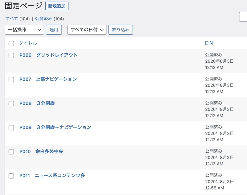 この方法であれば、希望通りの順番に固定ページ一覧が並びます。ただ、デメリットは「タイトルにユーザーさんに関係ない謎の番号が表示されてしまう」ことです。検索や表示に影響がない会員サイトなどであればよいかもしれませんが、一般公開のWEBページでこちらの方法をつかう場合は使用の注意が必要です。