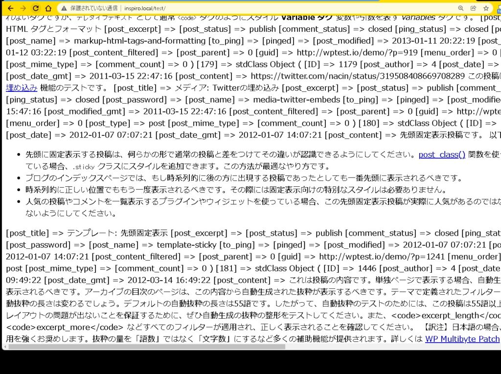 ひとまず、wp_postsテーブルからデータを取り出して表示させてみます。下記のように書きます。