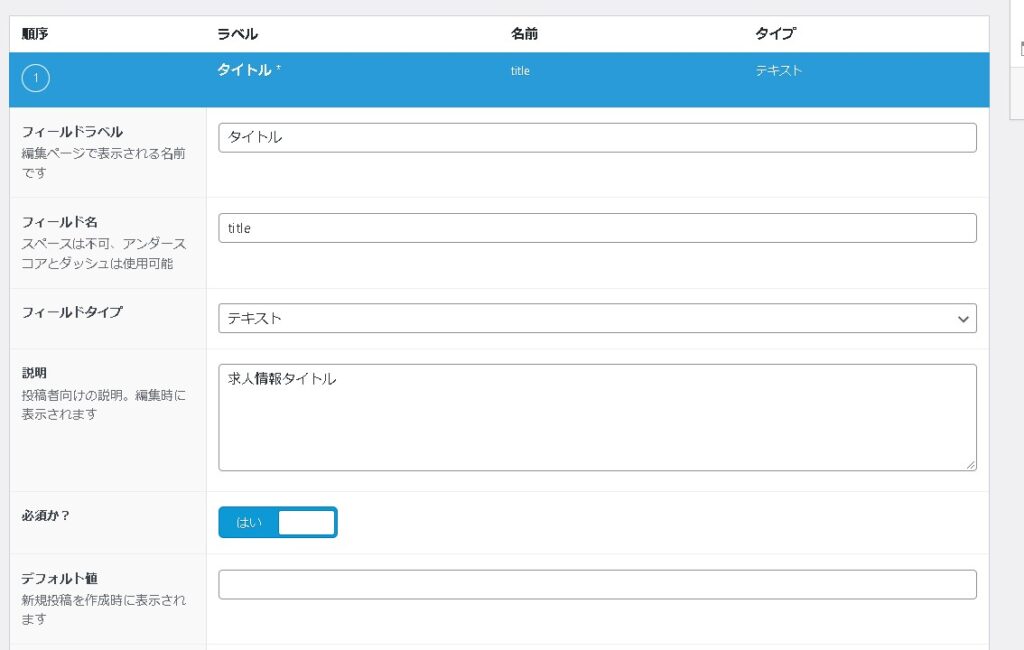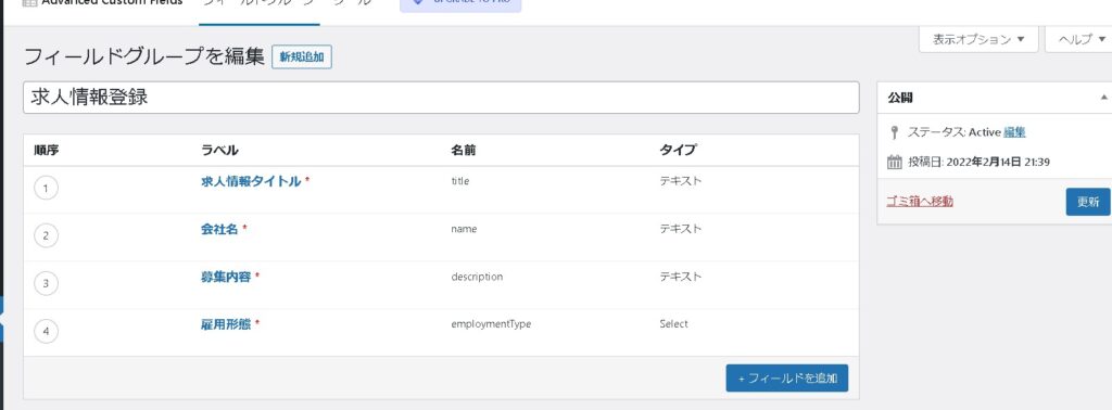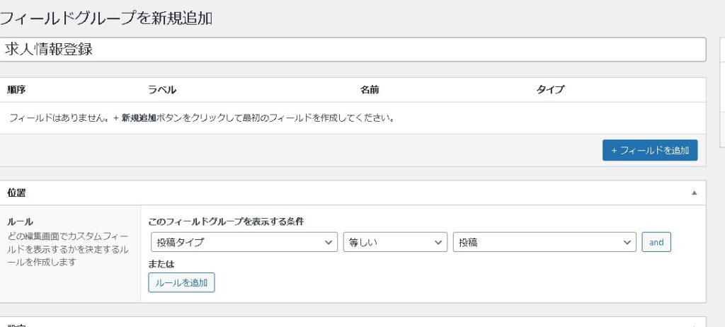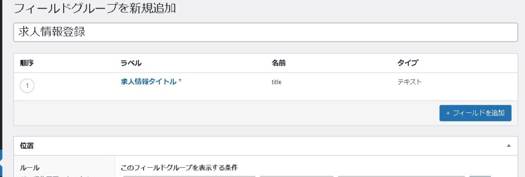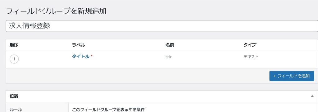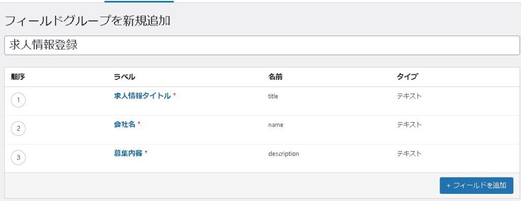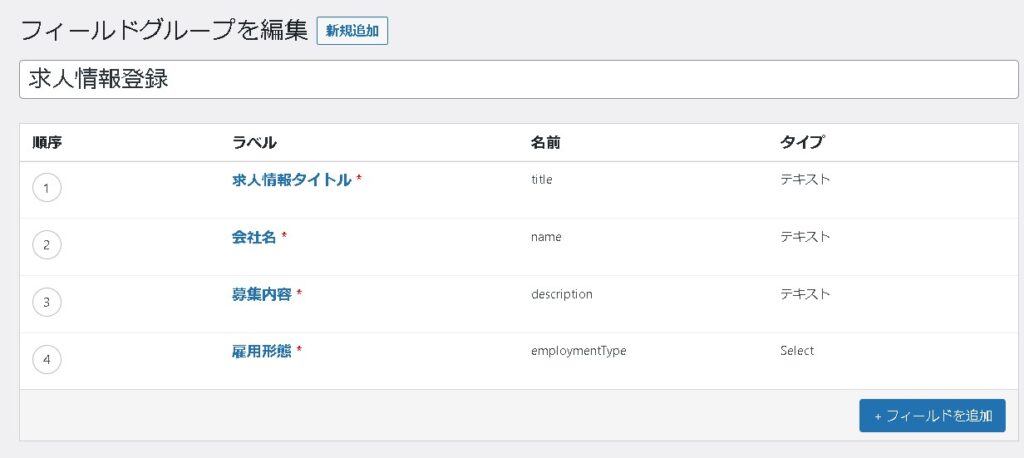 「フィールドグループを新規追加」から、カスタムフィールドの新しいグループを作成します。例えば「求人情報登録」といった名称を作ります。