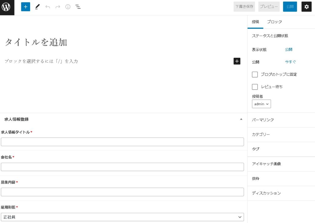 投稿画面を見てもらうと、通常の投稿画面の下にカスタムフィールドの欄が追加されています。