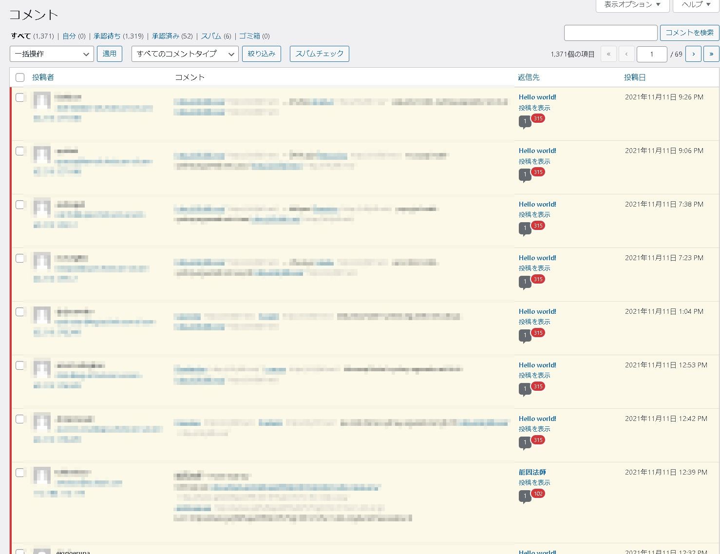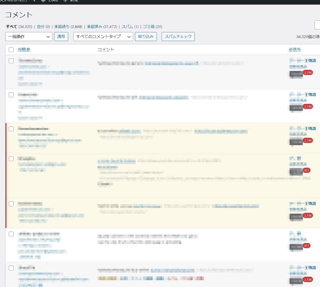 久しぶりにワードプレスの管理画面を開いたら、大量のコメントが…。ということもあるかと思います。