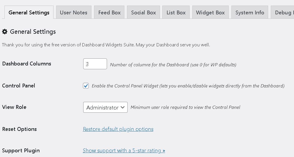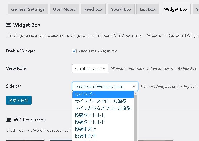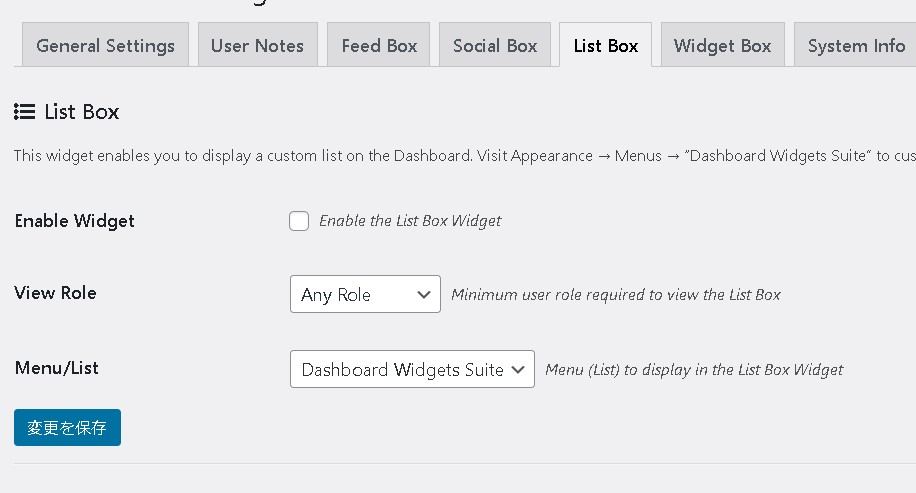 まずは基本設定です。ダッシュボードの列数(WPのデフォルトには0を使用)、表示できる役割を設定します。