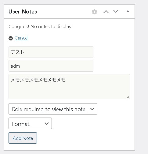 User Notes Widget(ユーザーノートウィジェット)の設定ができます。文字のサイズやフロントエンドエンドで表示させるかどうか?などの設定ができます。