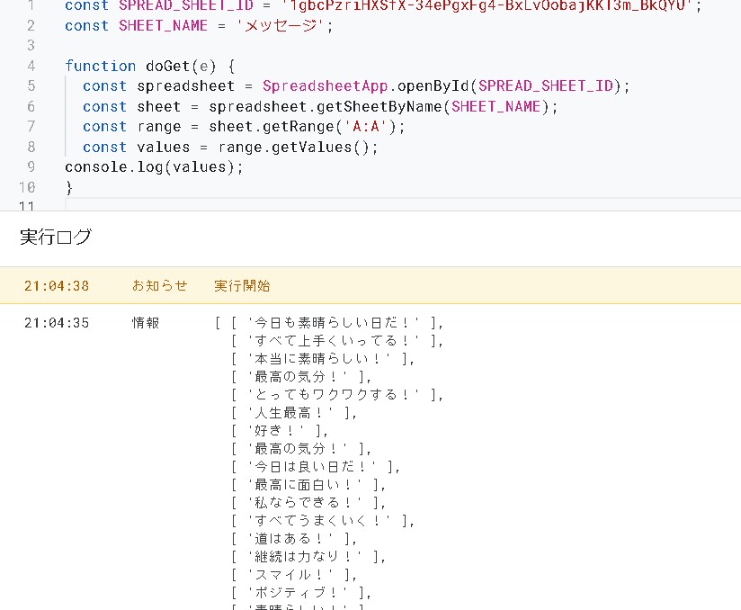 ログでデータが取得できました。A列の情報をdataに格納してログで出力しています。