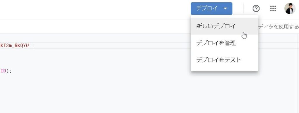 外部のサービスからデータ取得できるように、デプロイします。「新しいデプロイ」を選択します。