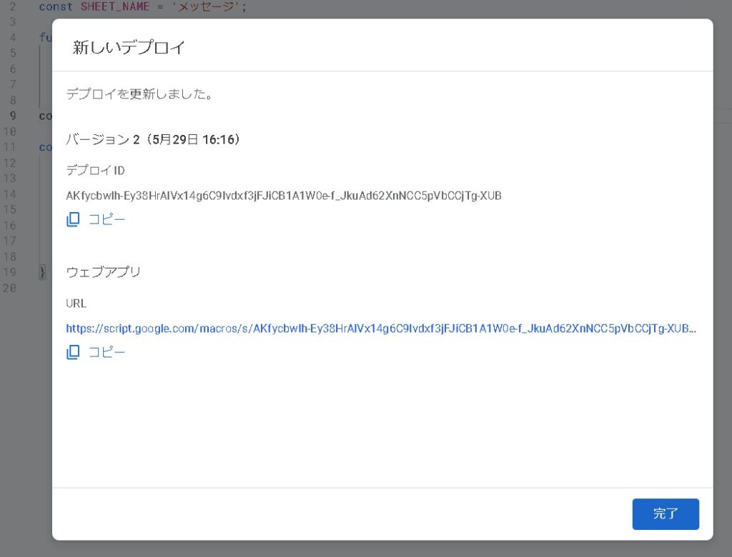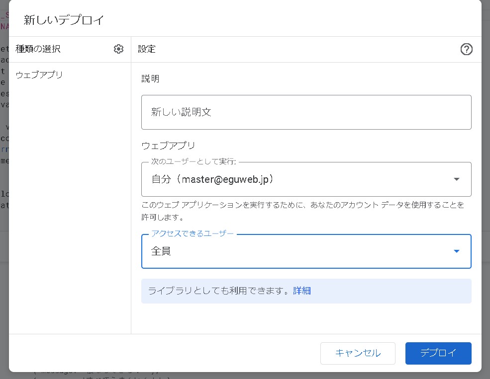 種類の選択「ウェブアプリ」>アクセスできるユーザーは「全員」として公開します。