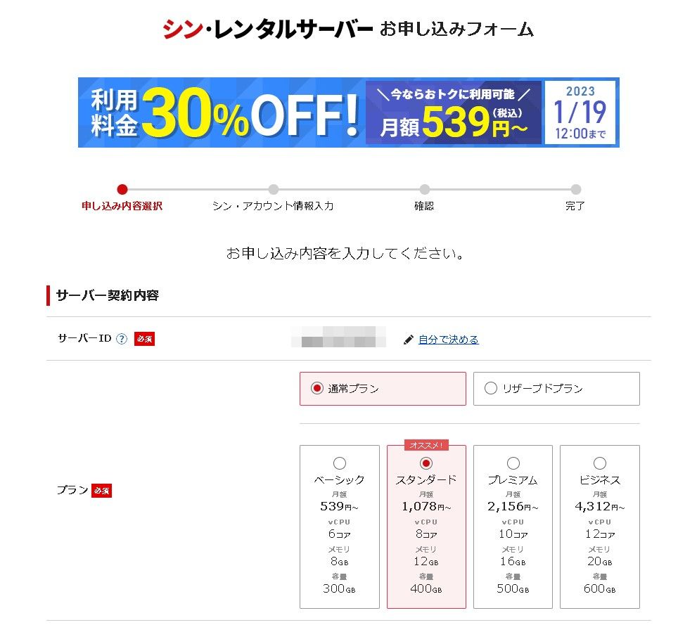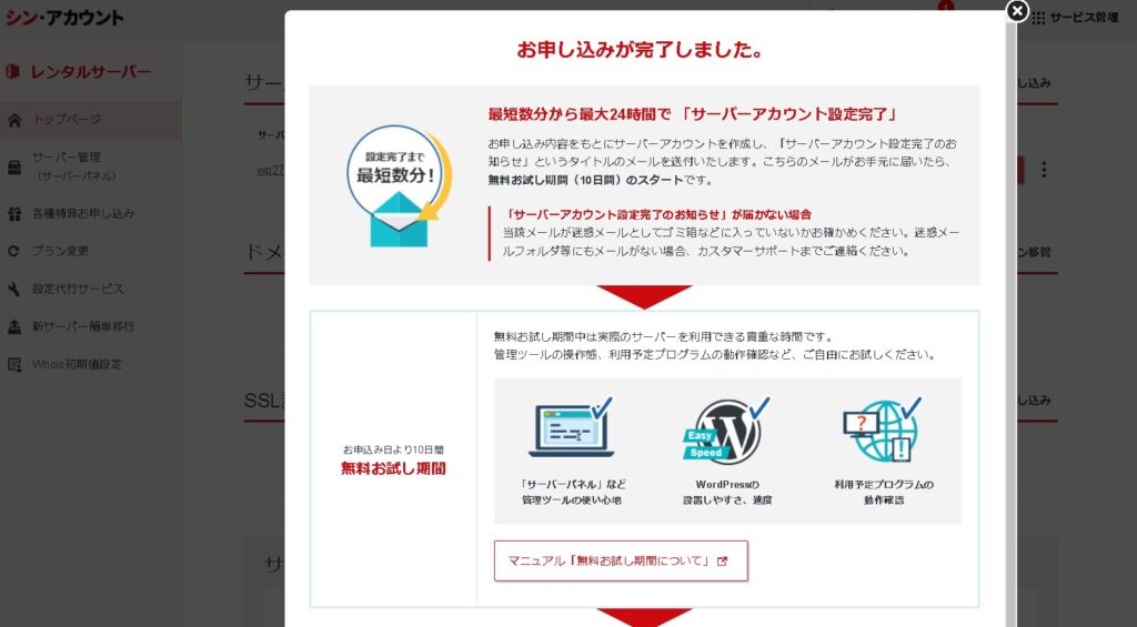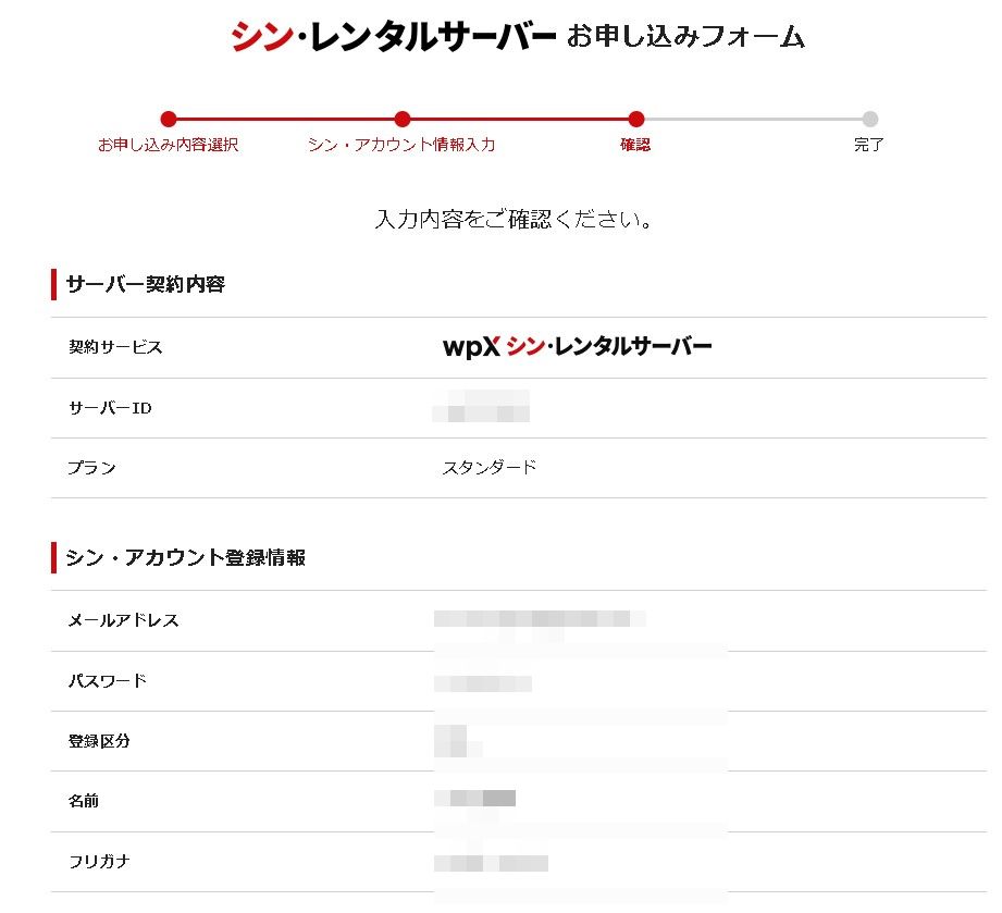 内容確認画面が表示されますので「この内容で申込みする」を押すと、レンタルサーバーの申し込み完了となります。