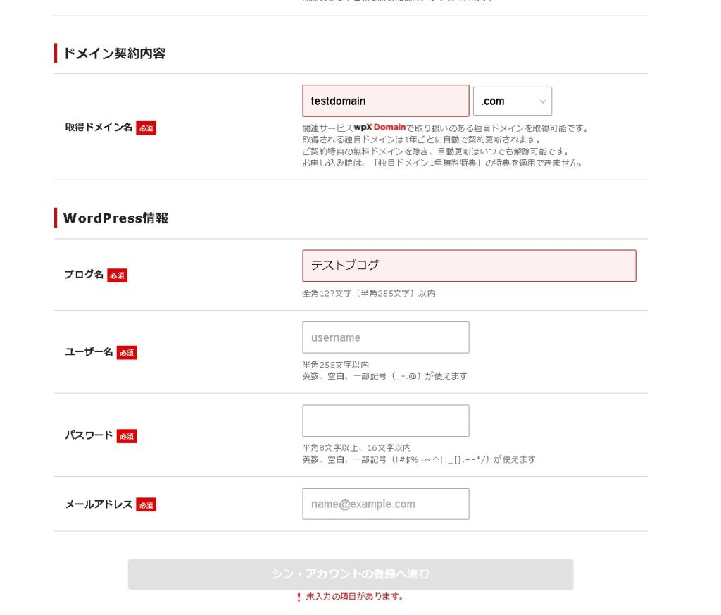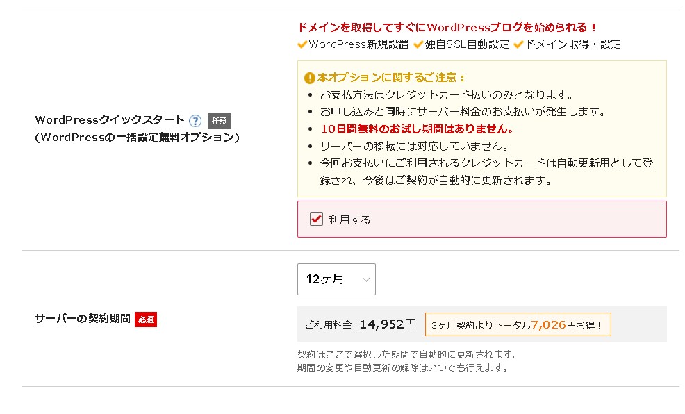 もし、取得したいドメインが決まっている場合は、こちらから取得すると最短でワードプレスサイト設定と作成が完了します。お試し期間無しで手続き完了になりますが、WEBサイトを作ることが確定している場合は、こちらで設定をしてしまった方が早いです。
