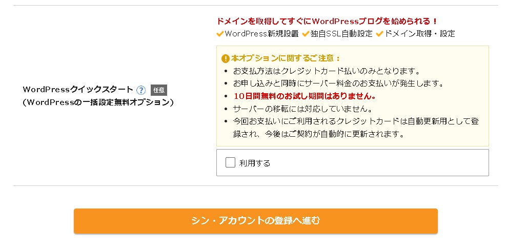 「WordPressクイックスタート(WordPressの一括無料設定オプション)」を選択すると、最短ですぐにワードプレスを始めることができる設定です。
