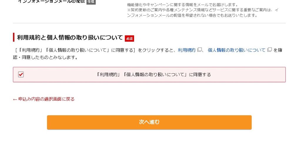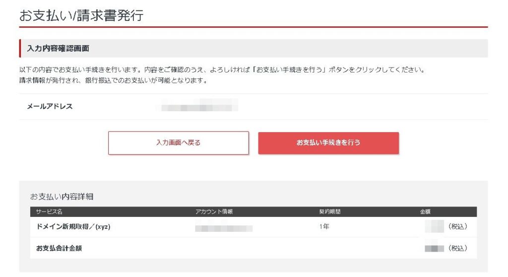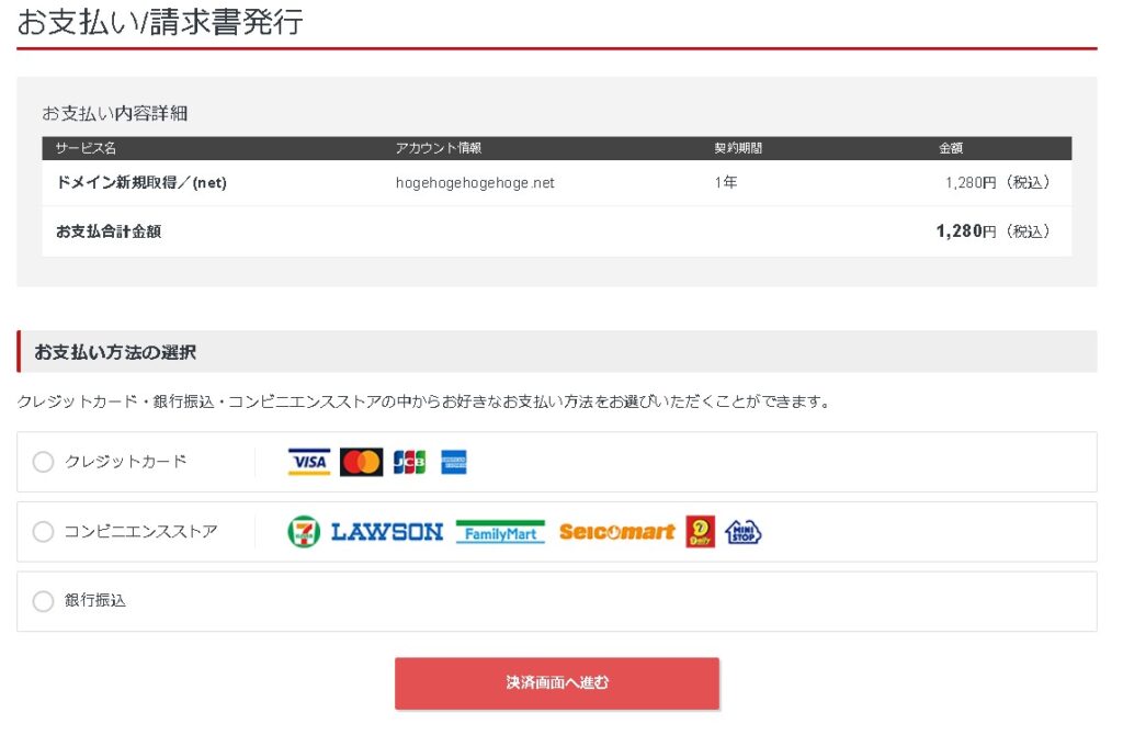 利用規約に同意するのチェックを入れたら、「お申し込み内容の確認とお支払へ進む」からドメインの決済に進みます。