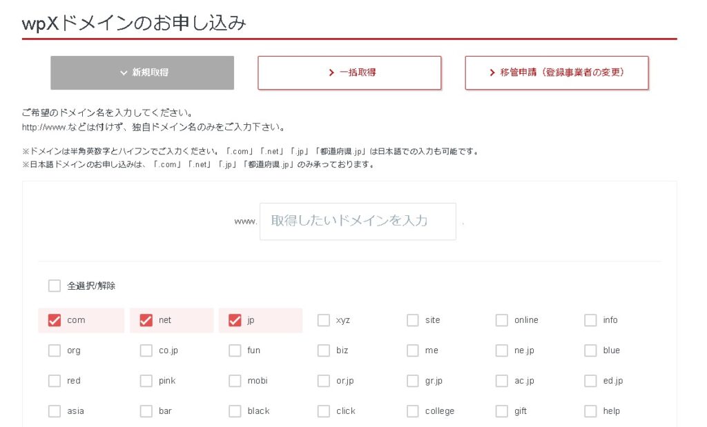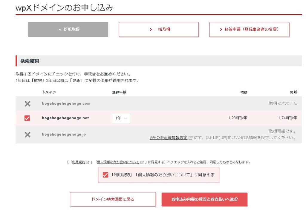 取得できるドメインが見つかったら、取得したいドメインだけにチェックを入れます。※全部チェックが入っていると全部契約になってしまうので注意しましょう。